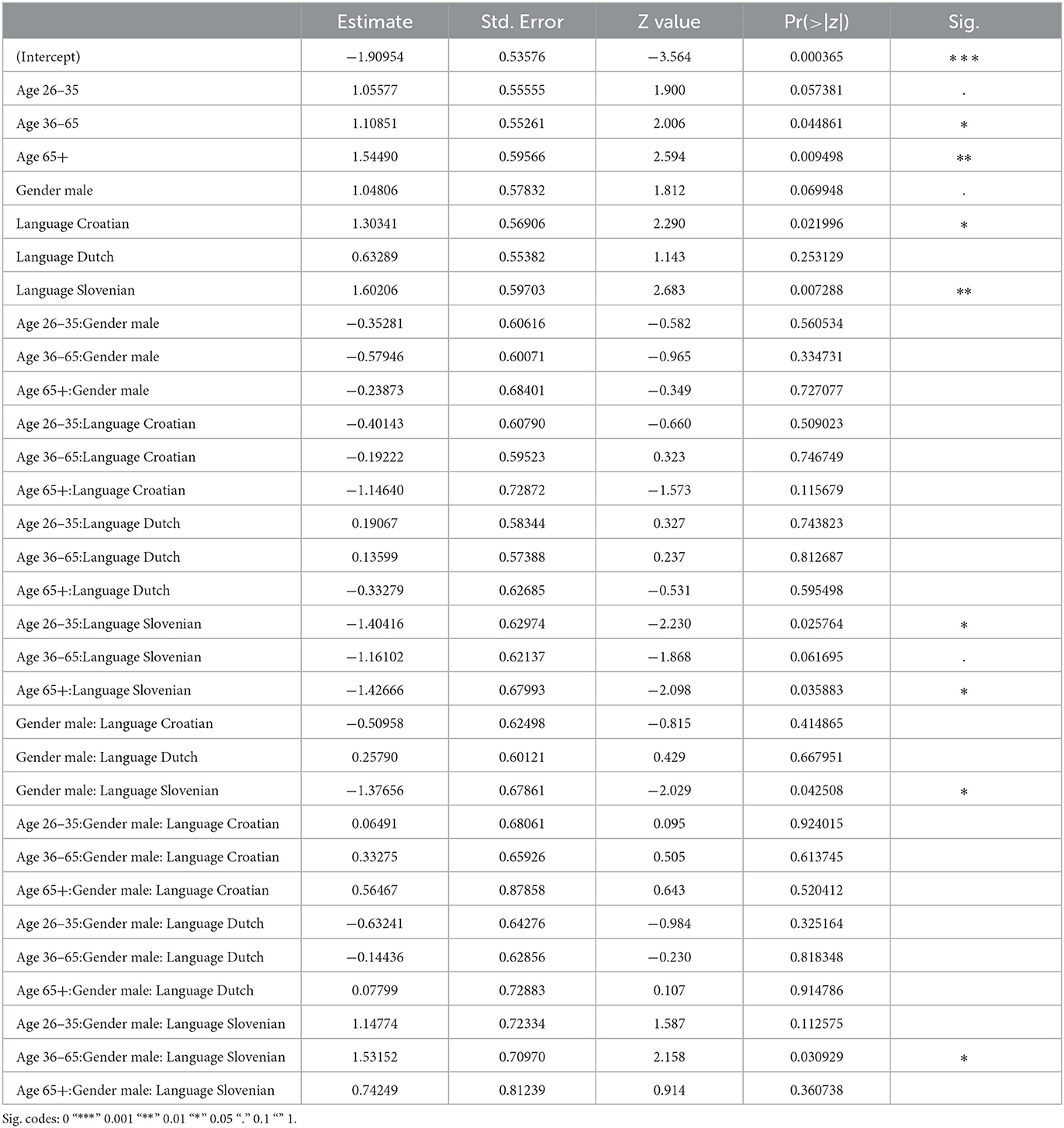 In the best fitting model for the data, a three-way interaction is included between the three sociodemographic variables: authors' gender identity, their age, and the language (area) of the news outlet page. This three-way interaction significantly predicts the hatefulness of the reader comments (Table 8 presents the summary table). Figure 5 illustrates the interaction by showing the age and gender patterns per language. As observed in the separate models above, Dutch stands out, with clearly different age dynamics for men and women. And for Slovenian, we now see that the highs and lows in male and female hate speech occur at different ages, but that both gender groups do not significantly differ from each other regarding hateful writing in the youngest and oldest age groups. This was not yet revealed by the separate model for Slovenian language. So the current dataset indicates that Slovenian men and women express their feelings of hatred and anger (and related emotions) to the highest extent at different points in their lives. It also suggests that men and women's social realities may differ in Slovenia between the working/active years of 26 and 65, but not so much during youth (−26) and older age (65+).