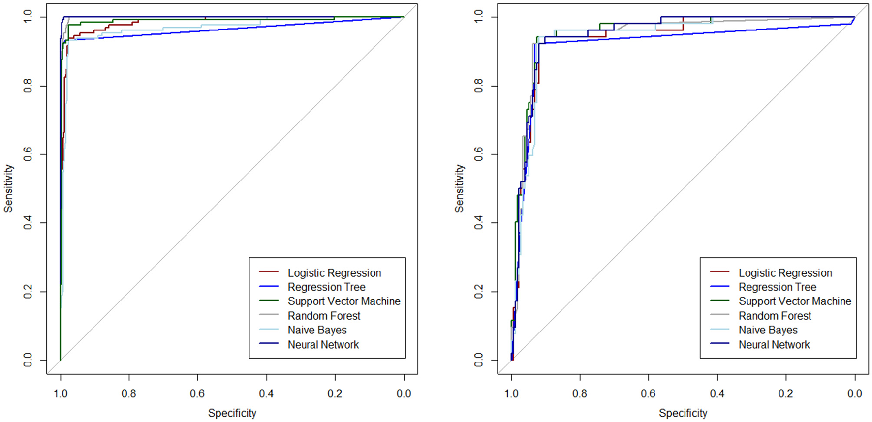 The ROC curves are plotted to determine the diagnostic ability of the ML algorithms in Figure 2, separately for the test and training datasets.