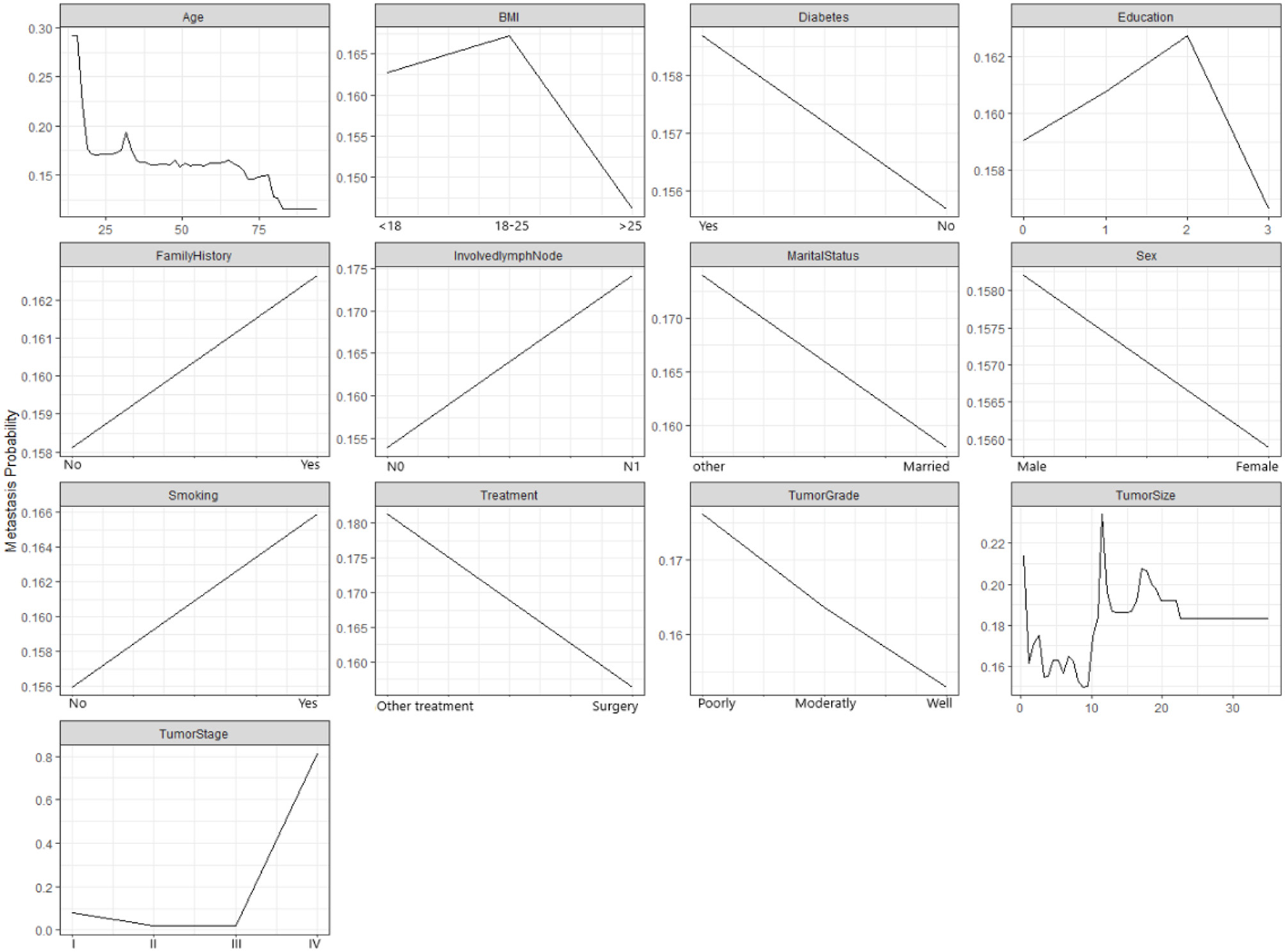 Figure 3 demonstrates how the probability of metastasis depends on various features of the patients and their tumors. Some of the graphs show a clear relationship between the feature and the probability of metastasis, such as age, tumor size, and tumor stage. For example, the graph for the tumor stage shows that the probability of metastasis increases as the the tumor stage increases, which means that more advanced tumors are more likely to spread than less advanced tumors. Some of the graphs show a weak or unclear relationship between the feature and the probability of metastasis, such as diabetes, education, family history, and marital status. For example, the graph for diabetes shows that the probability of metastasis is slightly higher for patients who have diabetes than for patients who do not have diabetes. However, the difference is not very large.