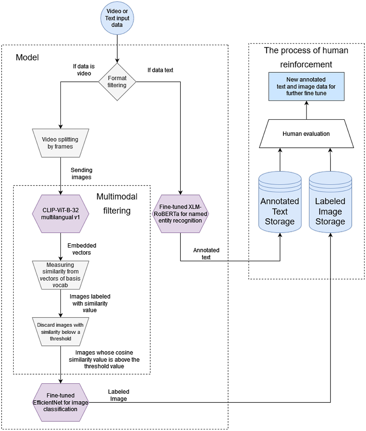 The tagged images and annotated texts from the processed video recordings and texts are transferred to permanent storage in the last step of the process. This dynamically growing dataset can be further validated with additional human support, and possible errors can be filtered. So, False positives and False negatives can be fed back into the training datasets.