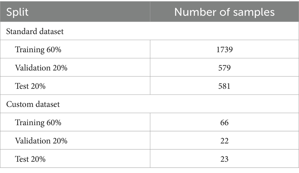 Splitting a dataset into two sections enables the assessment of the performance of ML and CNN models, aiding in model selection, hyperparameter tuning, and early halting decisions. Table 5 displays the standard and customized datasets for splitting.