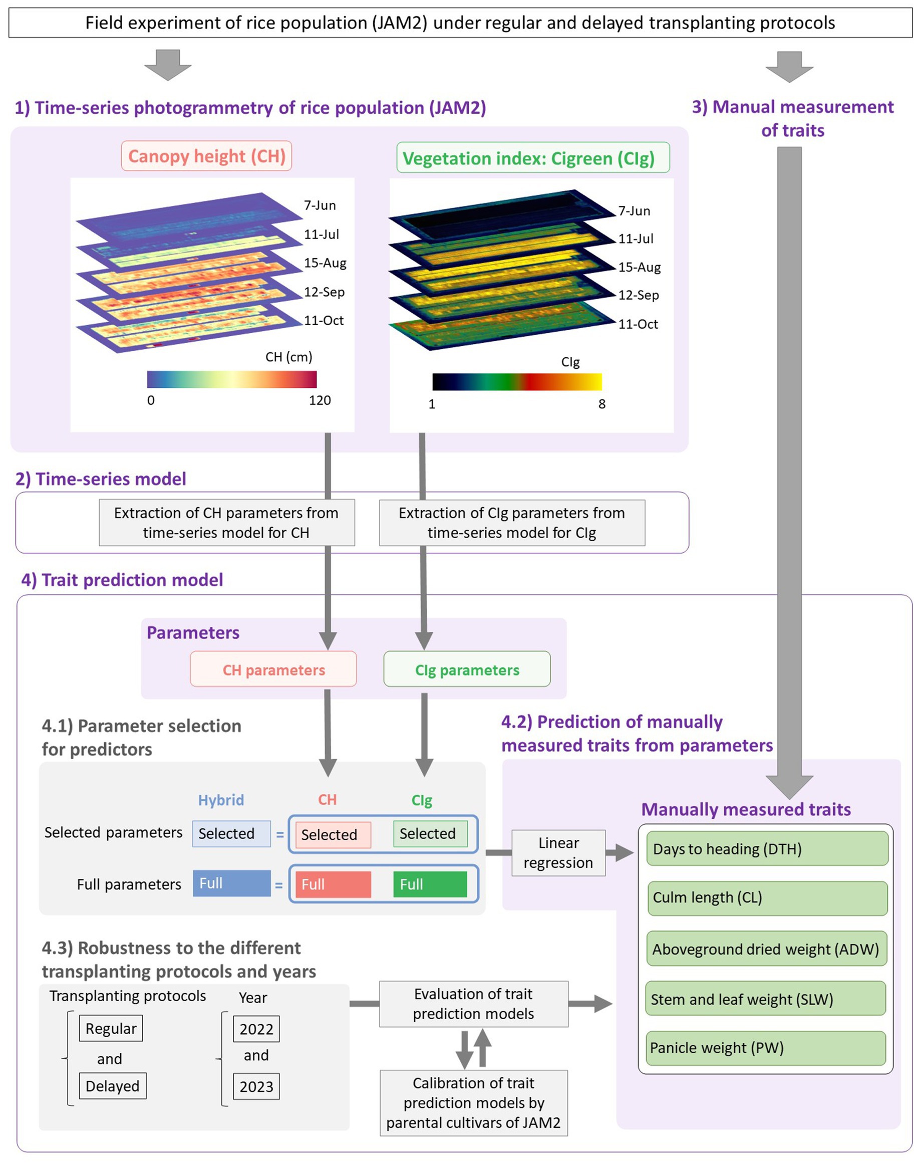 Figure 1. Framework of this study. (1) Time-series photogrammetry was used to extract CH and CIg data of the JAM2 lines grown in the field. (2) The CH and CIg parameters were extracted by fitting time-series models to the data. (3) Manually measured traits were obtained. (4) Linear regression models were then constructed to predict the manually measured traits from the CH and/or CIg parameters. (4.1) Six prediction models were constructed depending on the parameter types and whether variable selection was conducted or not, and model comparisons were performed. (4.2) The prediction models were applied for five manually measured traits. (4.3) The robustness of the prediction models to the different transplanting protocols and years were also evaluated.