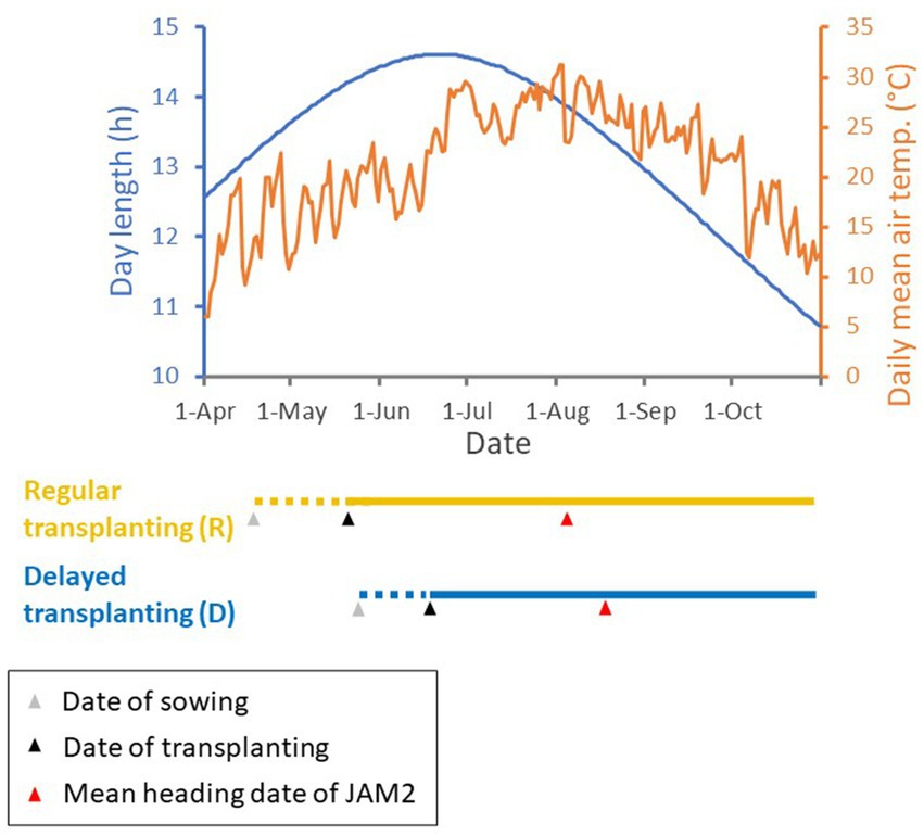 Figure 2. Regular and delayed transplanting protocols with meteorological data in 2022. Day length and daily mean air temperature are shown in the top graph, with the timelines of the regular and delayed transplanting protocols for the JAM2 lines shown below it. The period of rice seedling growth is shown by dotted lines, and the period of cultivation in the rice paddy field is shown by solid lines. The dates of sowing and transplanting are shown by gray and black triangles, respectively, and the mean heading dates are shown by red triangles. Monitoring of JAM2 lines with UAVs ceased at harvest. Day length and temperature data were acquired from Weather Data Acquisition System of Institute for Agro-Environmental Sciences, NARO.