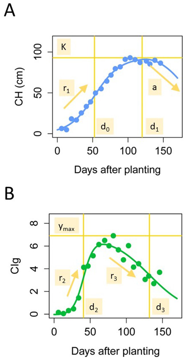 where is the days after transplanting. The parameters of the three-parameter logistic model were estimated by the same procedure of our previous study, the algorithm of which was implemented in the R package phenolocrop (Taniguchi et al., 2022). Parameter is the maximum value of CH, is the growth rate before the peak, is the time point at which the growth rate is a maximum, is the time point at which the maximum value of is reached, and is the rate at which CH decreases in the late growth period (Figure 3A). Different from CH, CIg time-series data described an S-shape with time; therefore, we adopted a double logistic model for the CIg data (Fisher and Mustard, 2007; Yang et al., 2012).