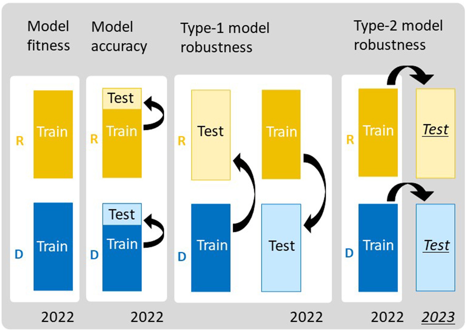 Figure 4. Frameworks for evaluating the performance of the prediction models. To assess model fitness, all data of regular (R) and delayed (D) transplanting protocols were treated as training data. To assess model accuracy, 10-fold cross-validation (10-CV) was used, in which each dataset was split into training and test data. Type-1 model robustness was assessed by using data from different transplanting protocols as training and test data. Type-2 model robustness was assessed by using the data from 2023 as the test data and those from 2022 as the training data.