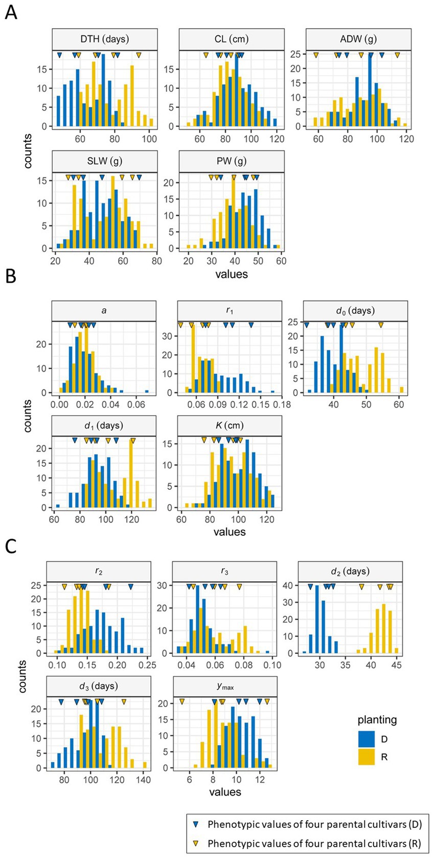 Figure 5. Frequency distributions of traits and parameters in 2022. (A) Manually measured traits. (B) CH parameters. (C) CIg parameters. R (yellow): regular transplanting, and D (blue): delayed transplanting. The blue (D) and yellow (R) inverted triangles indicate the phenotypic values of the four parental cultivars. DTH, days to heading; CL, culm length; ADW, aboveground dried weight; SLW stem and leaf weight; PW, panicle weight.