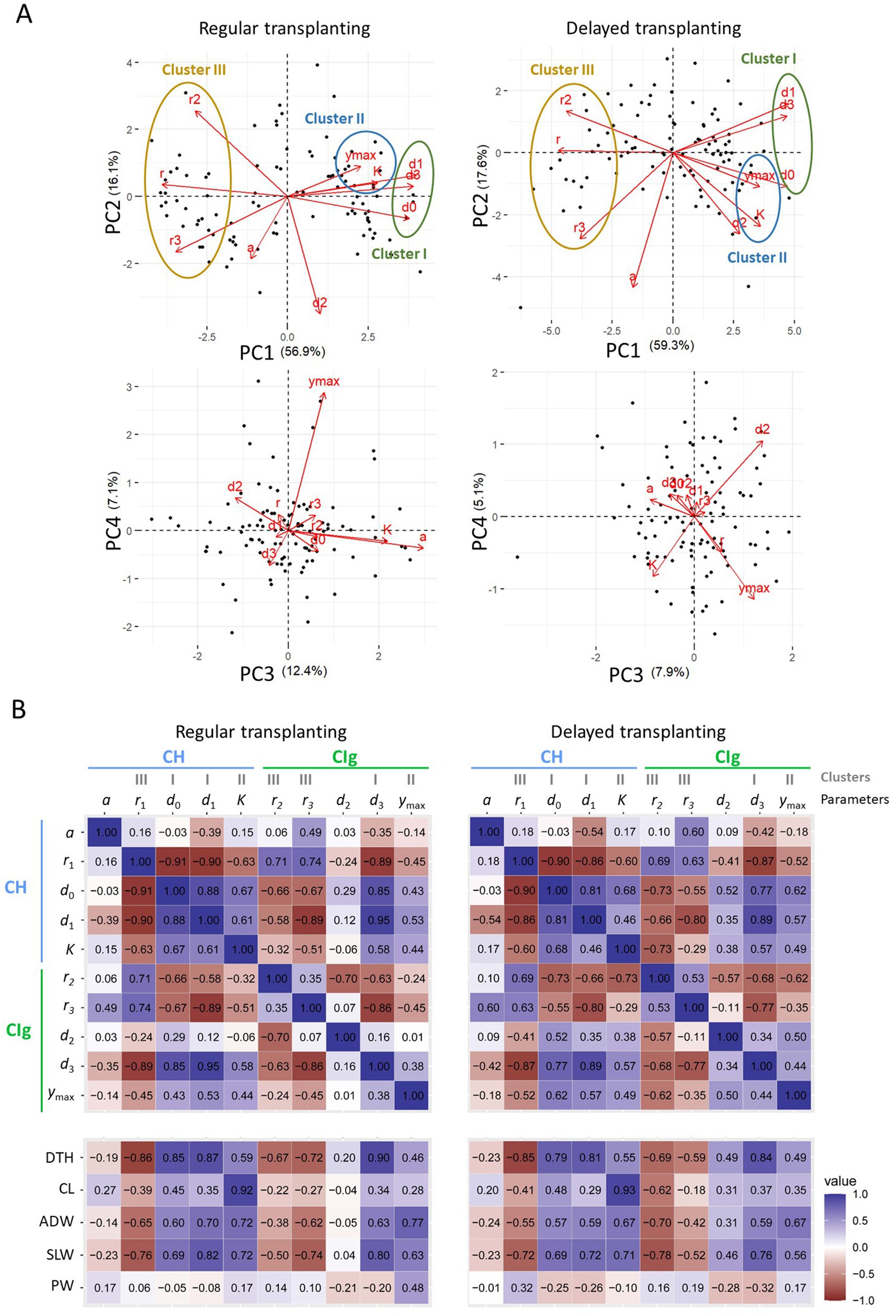 Figure 6. Relations between CH and CIg parameters and between the parameters and measured traits in 2022. (A) PCA results for CH and CIg parameters of data obtained under regular (left panel) and delayed (right panel) transplanting protocols. (upper) Biplots of PC1 and PC2; (lower) biplots of PC3 and PC4. The proportion of the total variance contributed by each principal component is shown in parenthesis. Black points indicate data of JAM2 lines, and red arrows indicate the correspondence of CH and CIg parameters to the PCA space. (B) Correlation coefficients between parameters for the regular transplanting (left) and delayed transplanting (right) protocols. The parameters are defined in 2.6. DTH, days to heading; CL, culm length; ADW, aboveground dried weight; SLW stem and leaf weight; PW, panicle weight.
