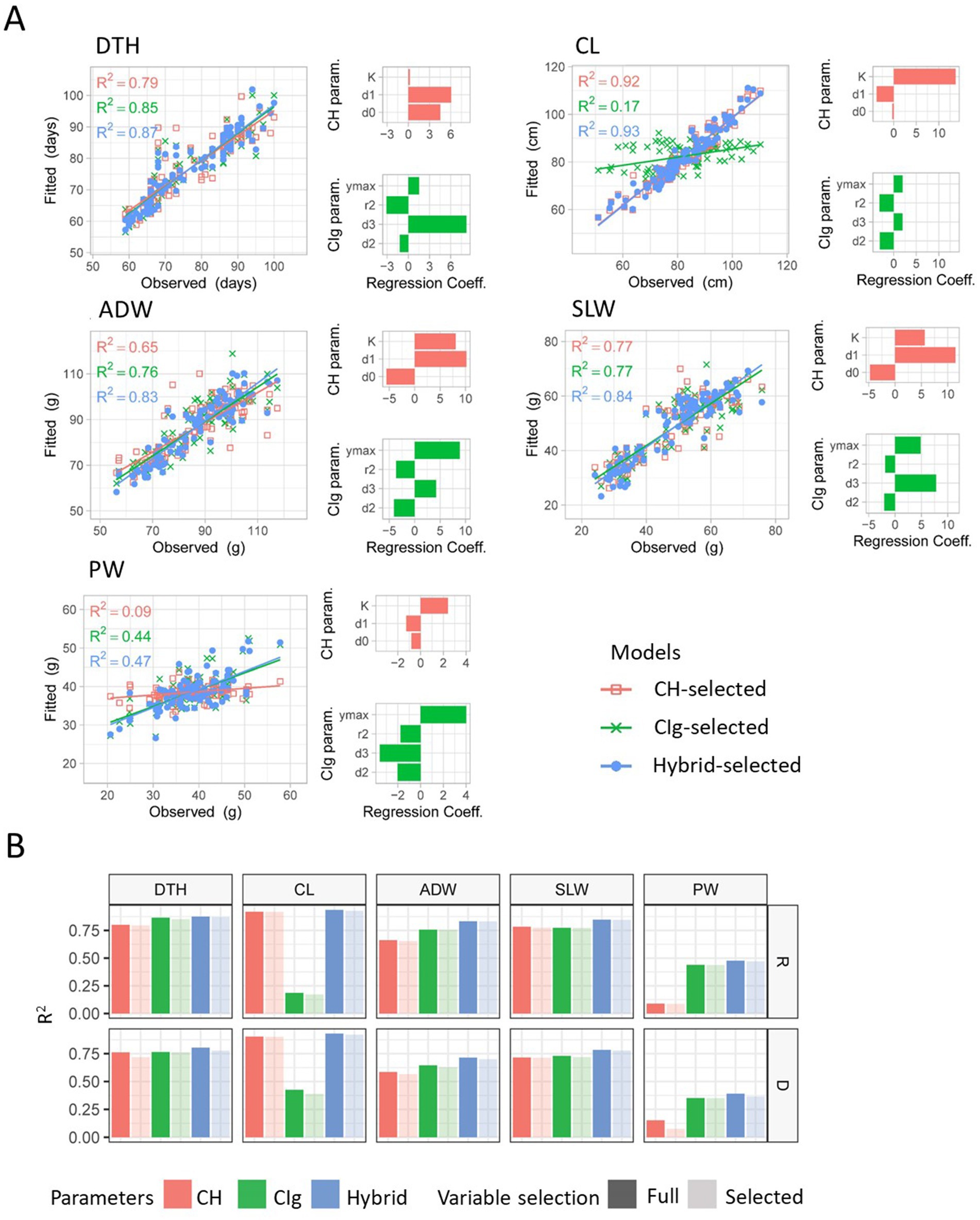 Figure 7. Model fitness for prediction of the dependent variables CL, DTH, ADW, SLW, and PW. (A) Model fitness results when regression models with the selected predictors were fitted to the regular transplanting protocol data. Scatter plots show the relations between the fitted values and the observed values. The CH-, CIg-, and Hybrid-selected models are distinguished by color. R2 values shown in each scatter plot represent coefficients of determination between fitted and observed values. Bar plots show the regression coefficients of each selected independent variable of the CH or CIg model. (B) R2 values for each dependent variable when regression models were fitted to the regular (R) or delayed (D) transplanting data. The colors indicate which predictors were used (CH, CIg, or Hybrid); light colors show the results when selected parameters were used, and dark colors show the results when full parameters were used. DTH, days to heading; CL, culm length; ADW, aboveground dried weight; SLW stem and leaf weight; PW, panicle weight.