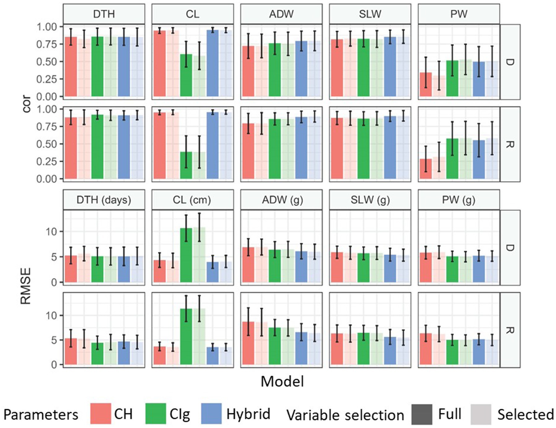 Figure 8. Model comparison for the prediction of each trait under model accuracy. Mean correlations and RMSEs obtained by 100 repetitions of 10-CV. Error bars indicate the standard deviation. Models were separately applied to delayed (D) and regular (R) transplanting protocol data. See Figure 5 for trait abbreviations. DTH, days to heading; CL, culm length; ADW, aboveground dried weight; SLW stem and leaf weight; PW, panicle weight.