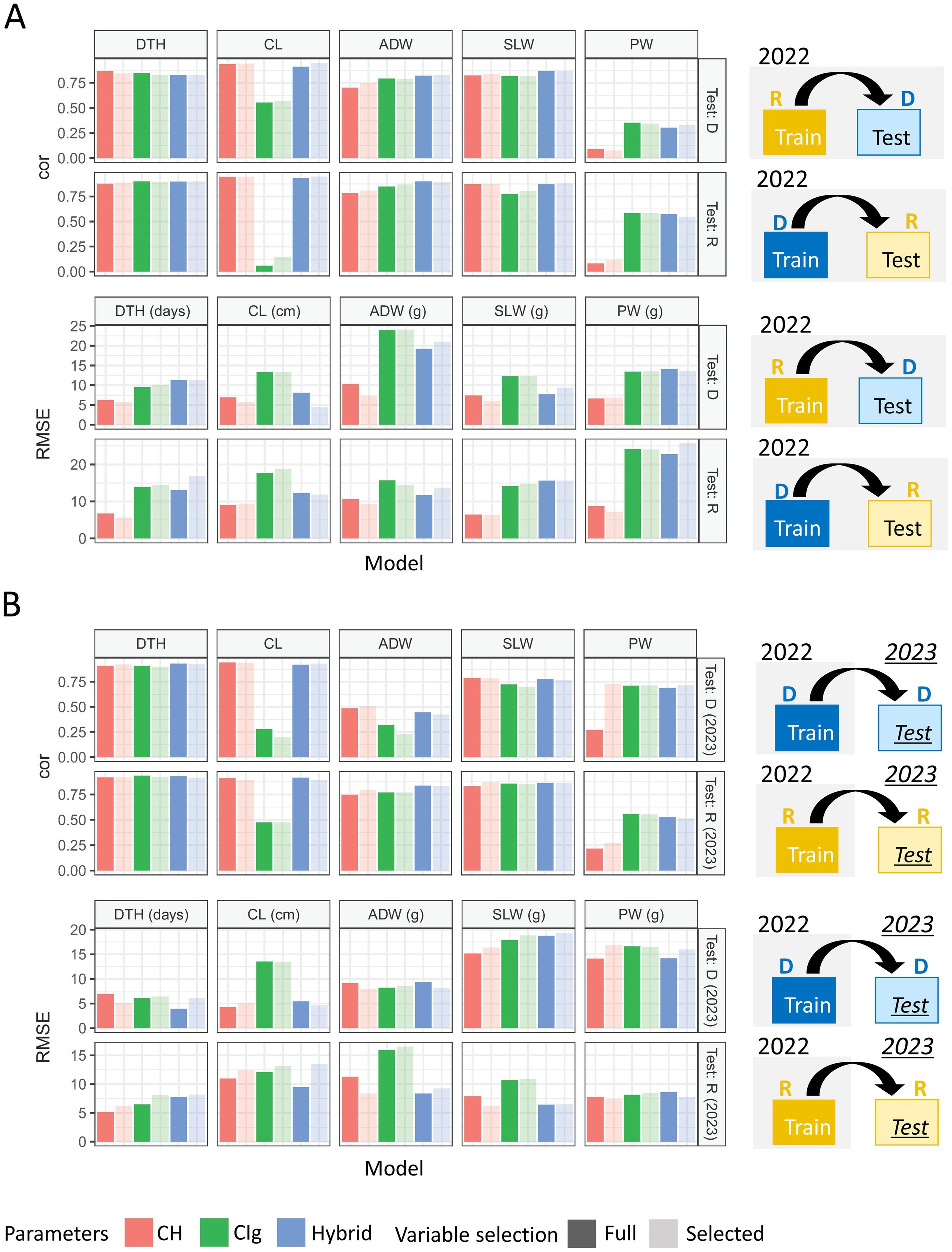 Figure 9. Model comparison for the prediction of each trait under model robustness. Correlation coefficients and RMSEs obtained by applying the prediction models to test data. (A) Under type-1 model robustness, cor values and RMSEs of each protocol were plotted for 2022: tested against data of delayed transplanting protocol (Test: D) or tested against data of regular transplanting protocol (Test: R). (B) Under type-2 model robustness, cor values and RMSEs of each protocol were plotted: Test: D (2023) or Test: R (2023). DTH, days to heading; CL, culm length; ADW, aboveground dried weight; SLW stem and leaf weight; PW, panicle weight.