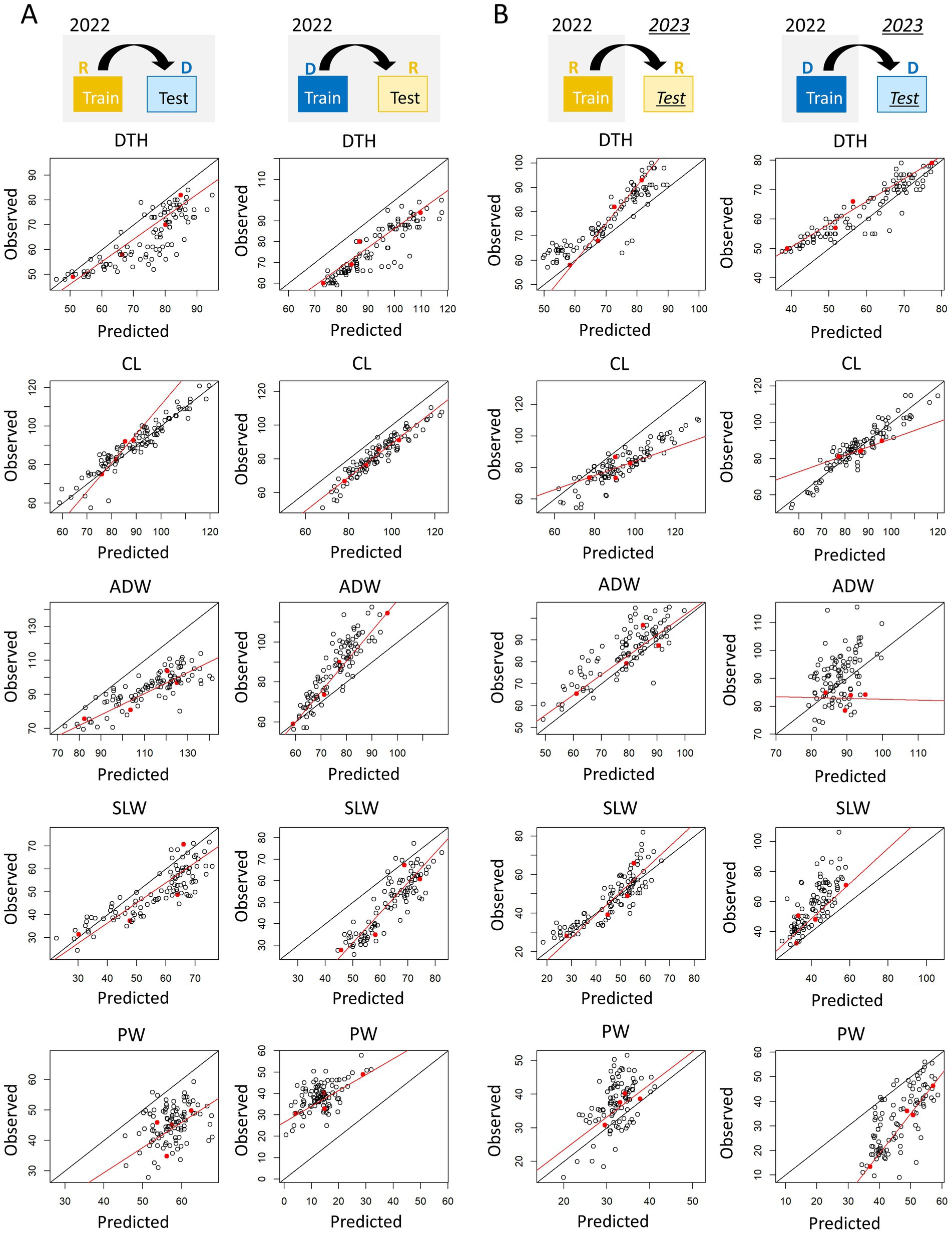 Figure 10. Visualization of the calibration process. Each panel shows the predicted and observed values of each manually measured trait in terms of (A) type-1 model robustness and (B) type-2 model robustness. Black points are JAM2 lines, and red points are the parental cultivars used for calibration. The red lines represent calibration models trained by using the parental cultivars, and the black lines represent a one-to-one correspondence between predicted and observed values. DTH, days to heading; CL, culm length; ADW, aboveground dried weight; SLW stem and leaf weight; PW, panicle weight. R, regular transplanting protocol; D, delayed transplanting protocol.