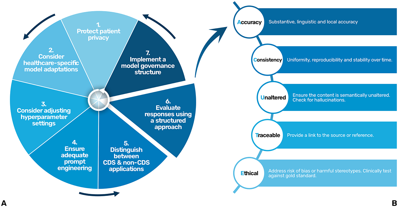 Figure 1. A step by step approach (A) and a structured evaluation approach (ACUTE) (B) for the responsible and safe use and development of LLMs in healthcare. CDS, Clinical Decision Support.