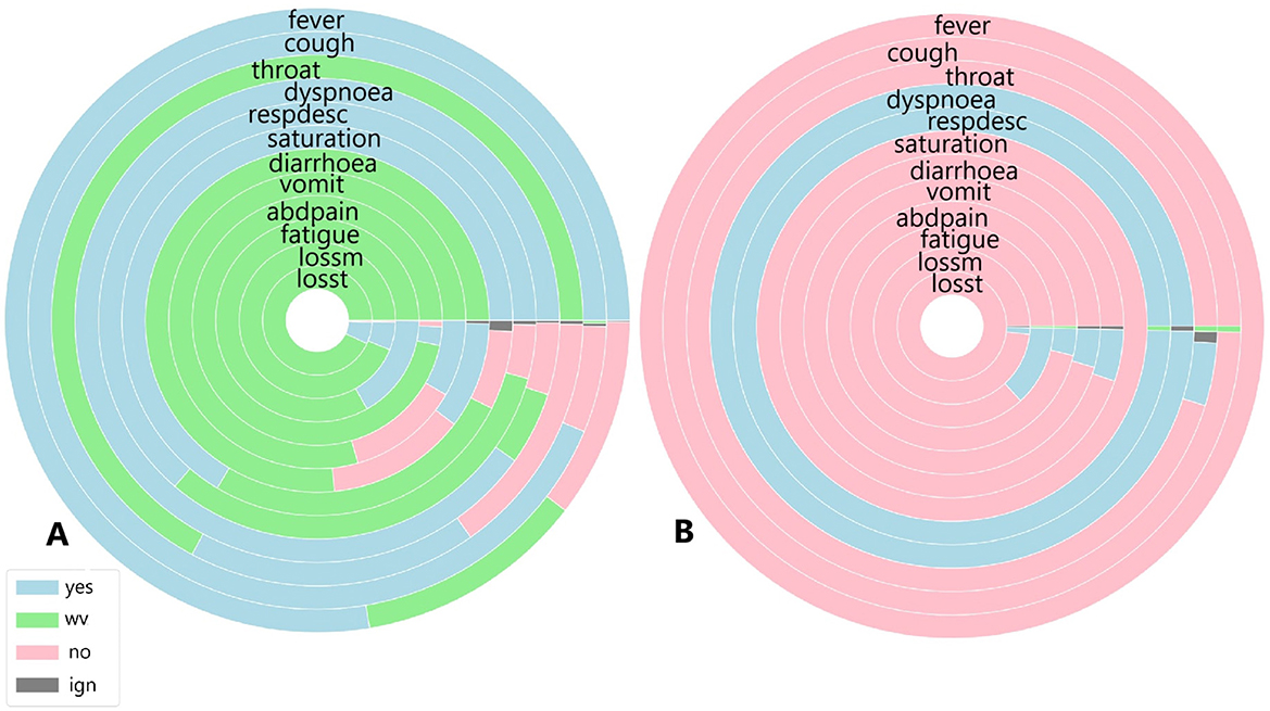 Figure 6. (A) Symptoms exhibited by individuals in the cluster with the highest and (B) the lowest COVID-19 and unspecified SARS infections reported in July 2020.