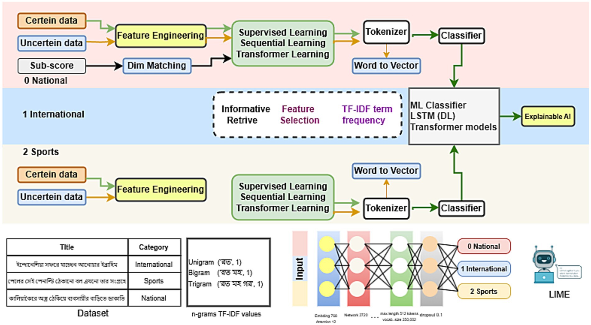 Bengali text classification is quite popular nowadays. In the newspaper, people give different opinions about national, international, politics, sports, etc. Our work is related to identifying different classes from titles. Sentiment analysis is a prominent aspect of NLP research, emphasizing the importance of identifying words that convey positive and negative meanings (Roy et al., 2023). Additionally, fake news, prevalent even in newspapers, can mislead people and obscure the truth (Fouad et al., 2022). Most algorithms struggle with plain text, making word embedding understanding essential (Wadud et al., 2022). The Transformer is a recent neural network model, well-supported for English but lacking resources for Bengali text classification (Alam et al., 2020). Fake news detection is also prevalent in other languages (Das et al., 2023a). Despite the significant resource gap for the Bengali language in NLP, some researchers have managed to categorize Bengali sentences into different forms (Das et al., 2023b). Sentiment analysis remains crucial, successfully detecting emotions in sentences (Bhowmik et al., 2021). For emotions like anger, disgust, fear, joy, sadness, and surprise in Bengali, researchers have proposed an interesting transformer-based method (Sourav et al., 2022). Cyberbullying is a common issue today, prompting NLP researchers to explore prevention methods (Ahmed et al., 2021). Malicious activities targeting government security also pose a significant problem (Aslam et al., 2022). LIME is an effective tool for explaining black-box machine learning models in various fields (Venkatsubramaniam and Baruah, 2022).
