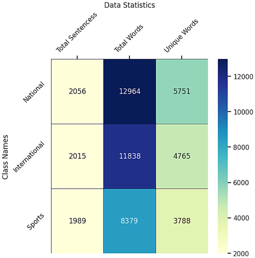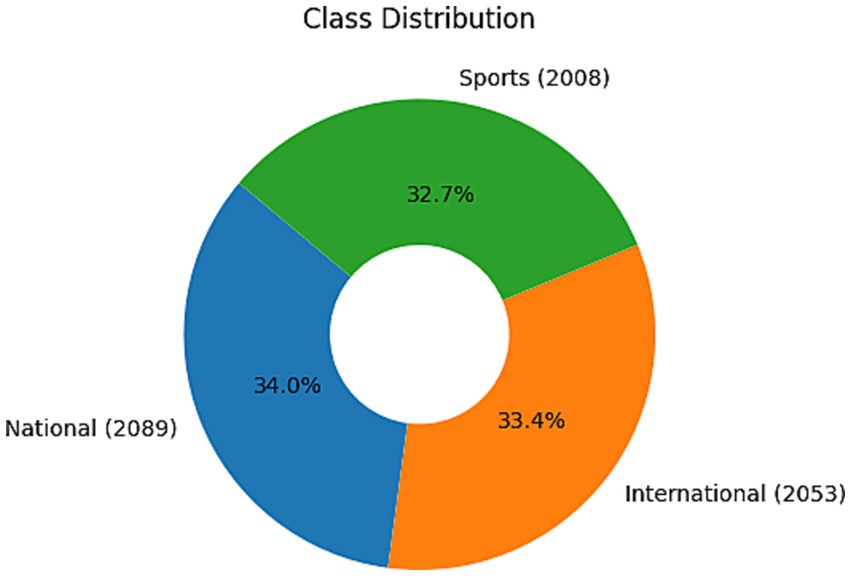 Moreover, Figure 6 shows that 2056 sentences are classified as national, 2015 sentences are in the international category, and 1989 sentences are sports-related in the dataset after the preprocessing.