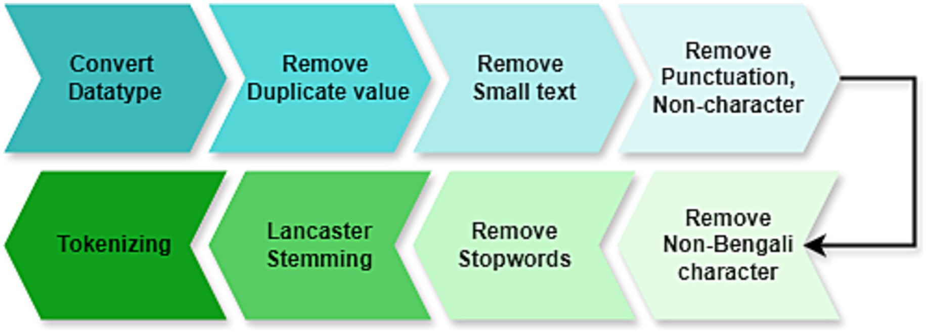 Processing the data is the crucial part for cleaning the data and making ready for training ML and DL models. Figure 3 presents the steps followed in data pre-processing. This pre-processing step includes data cleaning by removing unnecessary items from the dataset, and then removing stopwords, tokenizers, stemming, null value handling, removing duplicate values, small texts that have no meaning and punctuations, and non-Bengali characters, then removed stopwords, then used Lancaster stemming and tokenized the dataset. For example, “ভাষাশিক্ষক মিথিলা”(Language teacher Mithila). This sentence will not help models identify their category. Steps of pre-processing the data the following order.