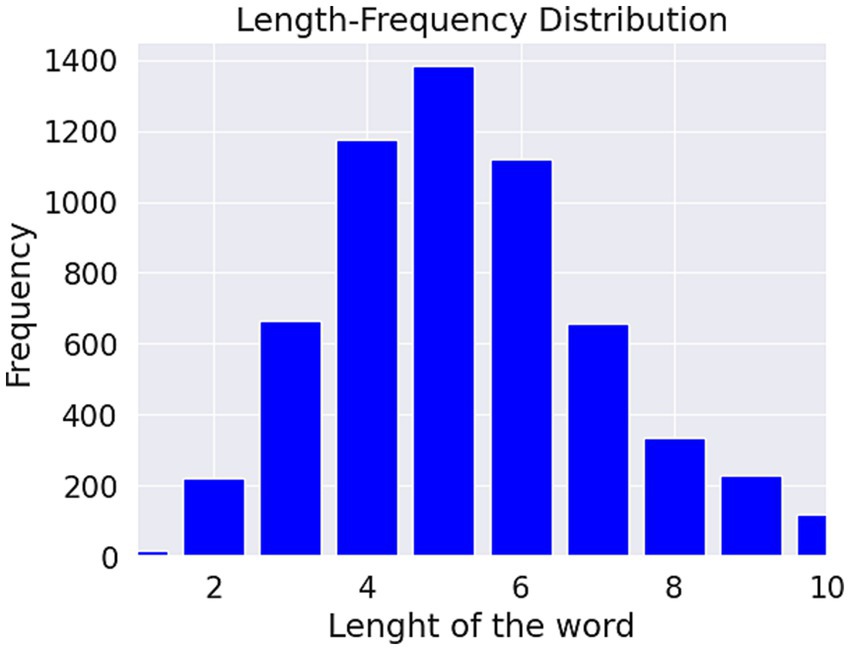 Figures 4, 5. show the length-frequency distribution of words and characters, respectively.
