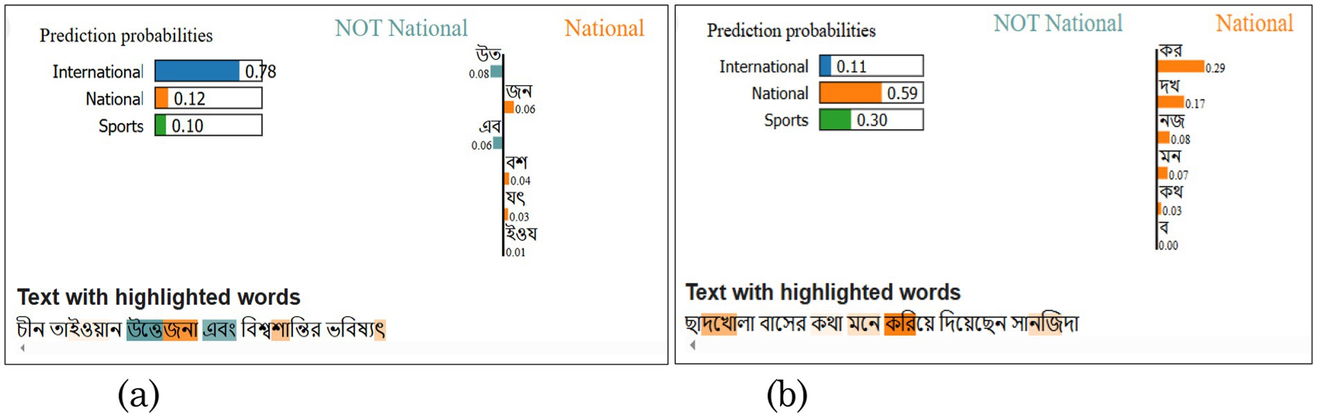 Explainability in a model refers to the capacity to comprehend and interpret the processes by which the model generates its predictions or decisions. While a model may demonstrate high performance and accuracy across various tasks, it often functions as a “black box,” making it challenging to ascertain the rationale behind specific predictions or outcomes. LIME (Ribeiro et al., 2016) initiates the process by altering the Bengali newspaper, introducing subtle modifications such as rearranging, excluding, or inserting words. This approach aims to evaluate the model’s sensitivity to deviations in the input data. The altered Bengali newspaper is then input into the transformer-based black-box model, which produces a prediction. LIME subsequently identifies the key features from the altered instances that are most affected by these modifications. These local surrogate models approximate the behavior of the black-box model in the proximity of the selected instance, providing insight into the underlying decision-making process. The knowledge derived from these local models is then leveraged to explain the predictions made by the black-box model on the original dataset. Typically, these explanations emphasize the terms or critical features that have a significant impact on the model’s decision-making, thereby enhancing the interpretability of the predictive mechanism. Through a systematic and iterative methodology, LIME aids in uncovering the complexities of machine learning models and promotes their transparency, thereby fostering greater confidence in the accuracy of their predictions.