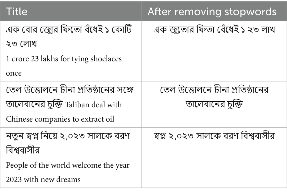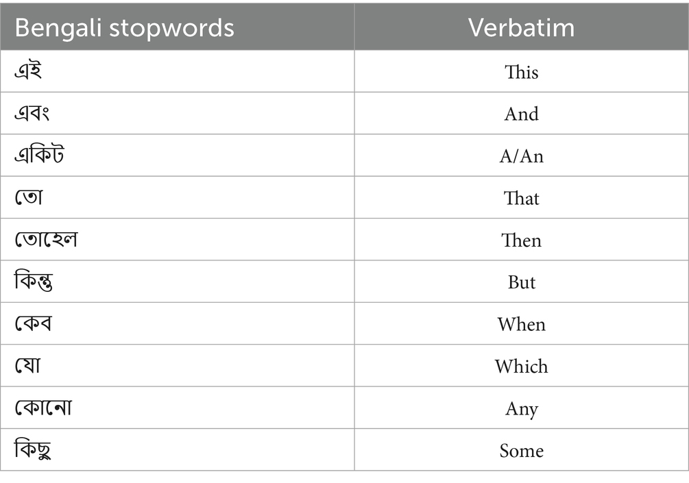Remove Stopwords: Stopwords are usually those words that do not have significant meaning in Bengali (Luhn, 1958), so these cannot be taken as a tokenizer. Thus, these are noisy data. Moreover, stopwords ain’t verbs or tenses and so generate ambiguity. Table 2 shows some of the Bengali stopwords. While processing Bengali text, these stopwords are removed for models to understand Bengali text and perform better. This step reduces noise. These noises are created because of several uses of these words. Table 3 has three columns showing the results of removing the stopwords from the sentences.