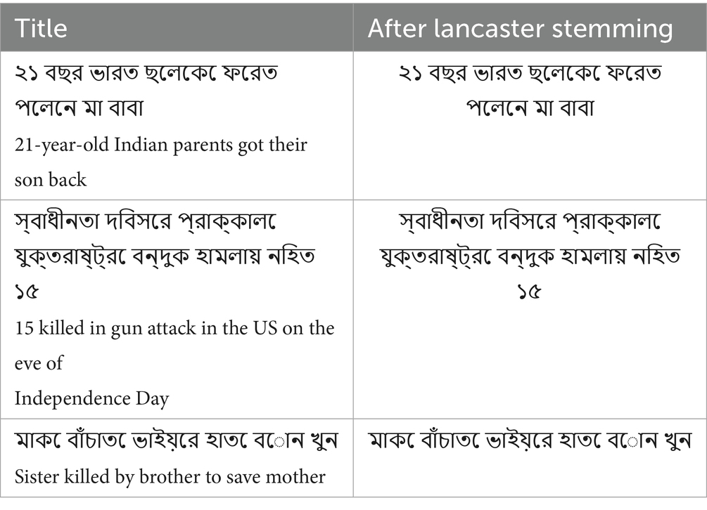 f. Stemming: In NLP, stemming means bringing words to their root form. Using this technique, words are reduced to their base form. In this research, Bengali text is produced for training models so that machines can understand it more accurately. Table 4 shows the sentences before and after stemming. An additional column was added to the previous tables. This research is conducted using Lancaster stemming (Paice, 1990) on the dataset. In Lancaster stemming, there is no change in the sentences, which are shown in Table 4. Stemming covers morphological variation in Bengali (i.e., verb conjugations, plural markers), grouping semantically similar words together. Improves model efficiency but over-stems in some cases.