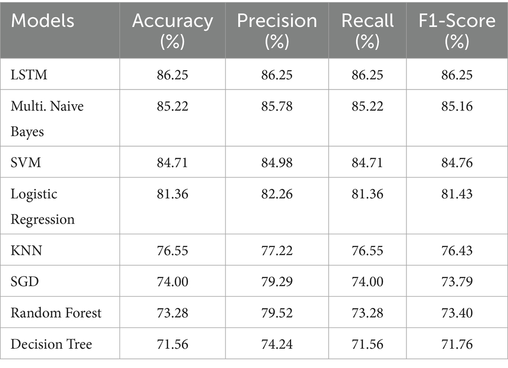 Table 6 shows the comparison of performance by ML models with LSTM. Among the ML models, Multi. Naive Bayes did a good performance with 85.22% accuracy. The best model among the DL and ML models is LSTM, which is the top performer. SVM also performed well, almost matching Naive Bayes. Logistic Regression also delivered a strong performance. However, the other models exhibited some issues. The precision was higher than the accuracy and other metrics. Table 7 shows the performance of BERT models, XLM-Roberta base outperformed with an accuracy of 91.38%. Here, the best two performing models are the XLMRoberta Base and Multilingual BERT, with an accuracy of 91.38 and 87.64%. But the DistilBERT’s performance was poor, infect very poor. Reason is that DistilBERT is trained on English data (Wikipedia + BookCorpus) only. Since, it’s not pre-trained on Bengali data or multilingual data, tokenization mismatched for Bengali text. DistilBERT is not familiar with Bengali vocabulary, this led to not understanding the tokens, thus giving this poor performance.
