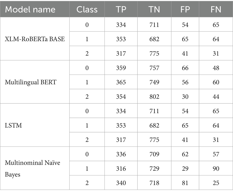 Table 8 illustrates the comparative performance of four top-performing models analyzed in this study: XLM-RoBERTa, Multilingual BERT, LSTM, and Multinomial Naive Bayes, respectively. Among these, Multinomial Naive Bayes and LSTM ranked fourth and third, respectively, while Multilingual BERT emerged as the second-best model. The highest-performing model was XLM-RoBERTa, achieving an accuracy of 91.38%. Notably, the BERT-based models demonstrated superior performance compared to both machine learning (ML) and deep learning (DL) models, as evidenced by higher true positive (TP) rates and lower false negative (FN) and false positive (FP) rates. Within the BERT-based models, XLM-RoBERTa outperformed Multilingual BERT, further validating its superior performance in terms of TP and FP metrics.