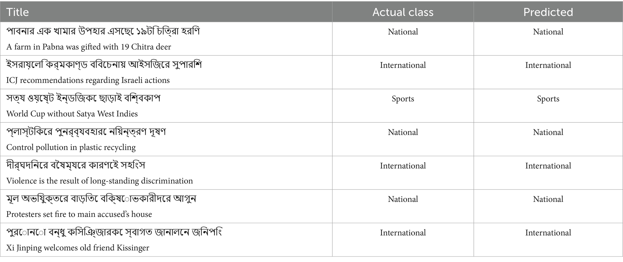 In this subsection, Table 10 shows the predicted output of the proposed model. The actual class is the labeled category of the titles, and the prediction column is the predicted class of the model. It seems that the models performed very well on predicting, though there are very few wrong predictions as well. But still, most of the titles are predicted accurately. It is cross-checked for confusing titles, and model mistakes while predicting.
