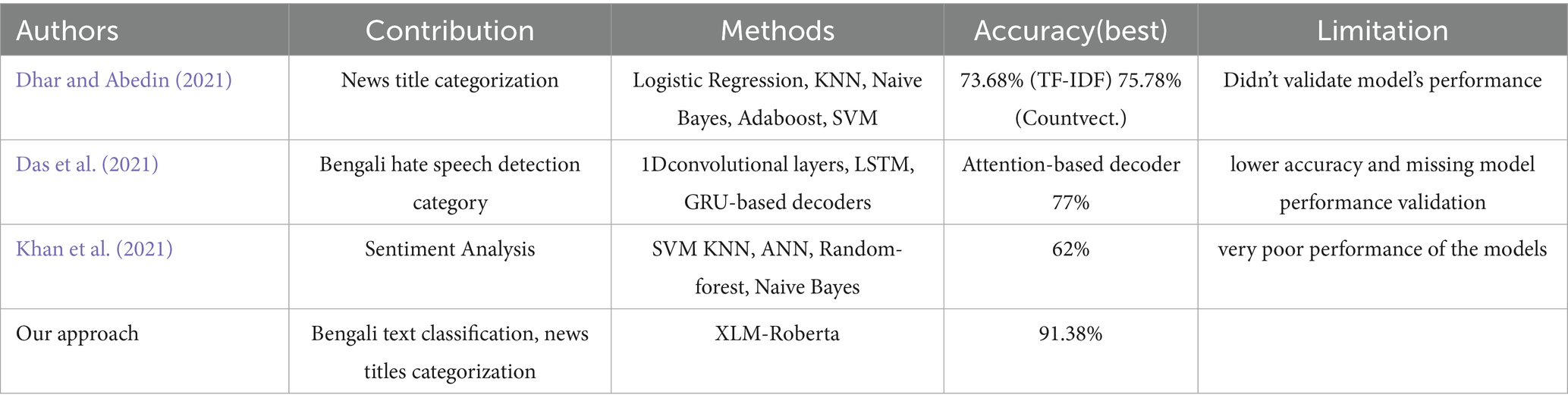 At present, a lot of research is going on in the Bengali language. Using machine learning and deep learning models, many studies are ongoing. Just like that, Hasan et al. (2023a) classified Bengali newspaper headlines by using LSTM, Bi-LSTM, and Bi-GRU models. Almost 10,000 data points were classified into six categories to achieve the expected result. From those three deep learning models, the Bi-LSTM provides the highest train and test accuracy of 97.96 and 77.91%, respectively. Al Mahmud et al. (2023) similarly proposed an approach to classifying Bengali news by using machine learning and deep learning models. Applied models are SVC, Random Forest, LSVC, LSTM, and GRU. The approach technique provided an accuracy of 95.45%, which is the highest among all the algorithms. Hussain et al. (2023) also did some comparison analysis of Bengali news article classification using some ML models. TF-IDF and count vectorizer were used for the feature extraction process. SVM and LR algorithms were applied, and SVM provided the highest accuracy of 84%. There were 20 categories, and 12.5 K labeled news articles were used. Adding more categories and applying more ML and deep learning might give a more optimal result. After that, Mahmud et al. (2023) evaluated news by using Natural Language Processing (NLP) and Human Expert Opinion. A total of three NLP models were applied for training and testing. The Bengali-Bertbase model provided the highest testing accuracy of 84.99%, and it increased after the 9th parameter, where it achieved 93.80% of testing accuracy. Then, Hasan et al. (2023b) did sentiment analysis and natural language processing (NLP) using transformers for Russia-Ukraine war-based comments in Bengali. The applied models for the analysis are mBERT, Distil-mBERT, BengaliBERT, XML-R(base), XML-R (large), and Bi-LSTM. The BengaliBERT model performed best and provided an accuracy of 86% with a 0.82 F1 score. Ahmed et al. (2023) also did Bengali sentiment analysis. E-commerce sentiment classification is done by using transformer-based and transfer learning models. A total of three models are applied for the analysis: LSTM, GRU, and BengaliBERT. For binary classification and multiclass classification, the highest accuracy was 94.5 and 88.78% in BengaliBERT, respectively. After that, Tareq et al. (2023) worked with cross-linguistic contextual understanding on Bengali-English code-mixed sentiment analysis. Several machine learning and deep learning models were applied with word embedding models to analyze the data. Among them, XGBoost with the code-mixed Fasttext model gained the best F1 score of 0.87. Haque et al. (2023) researched Bengali social media comments for multiclass sentiment classification by using machine learning models. 42,036 Facebook comments trained with features like TF-IDF, CV, and Word2Sequence are applied to several machine learning and deep learning models. Among all the models, CLSTM with the Word2Sequence model performed better than all with an accuracy of 87.80%.