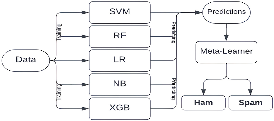 For our spam-detection system, we design a logistic regression-based meta-learner trained on the predictions of five individual machine learning models, as illustrated in Figure 1. We intentionally exclude deep learning models since they are computationally more expensive and less interpretable, while traditional ML models perform better on relatively low-dimensional data like ours, where preprocessing and feature extraction reduce input complexity (Taye, 2023; Sharifani and Amini, 2023).