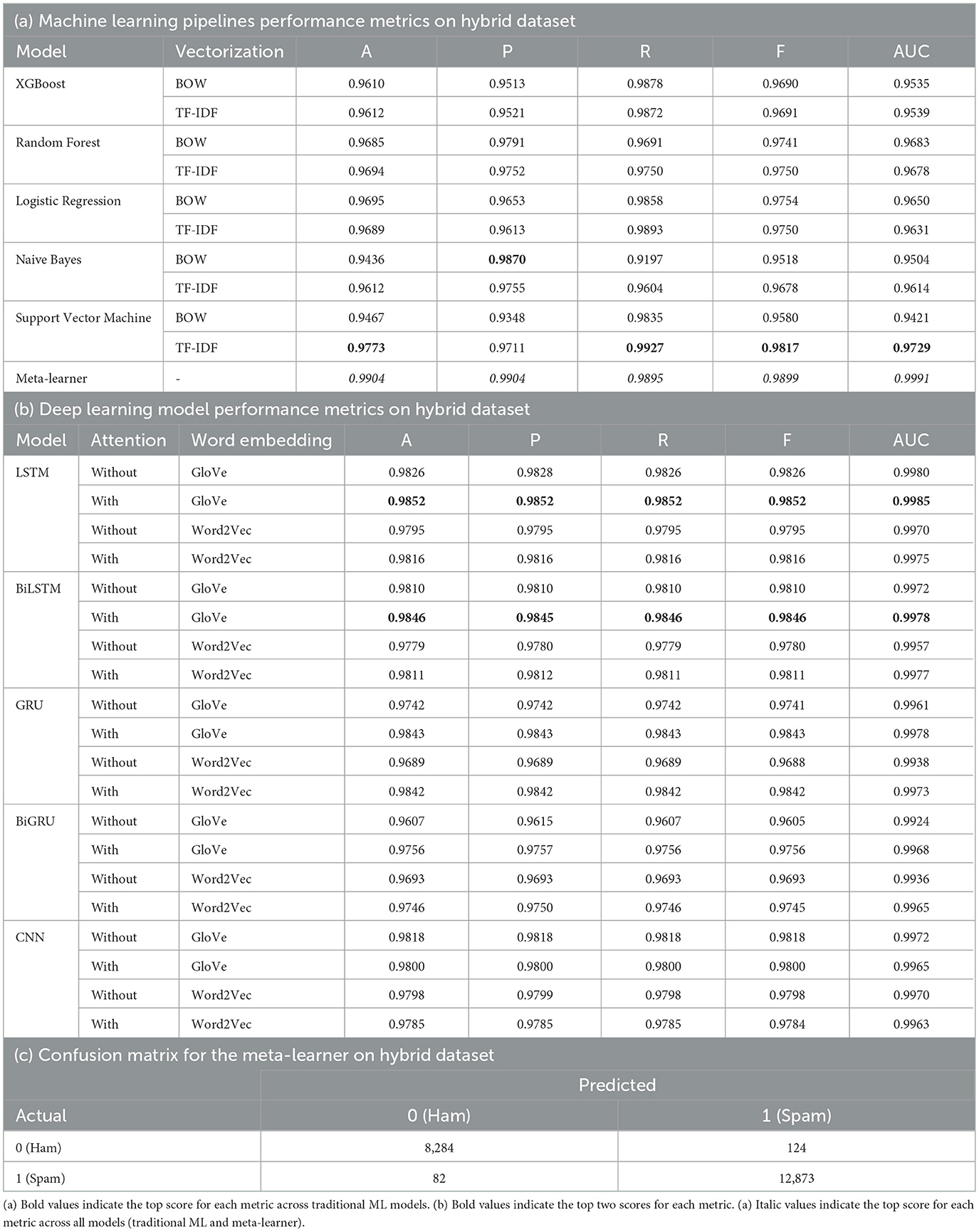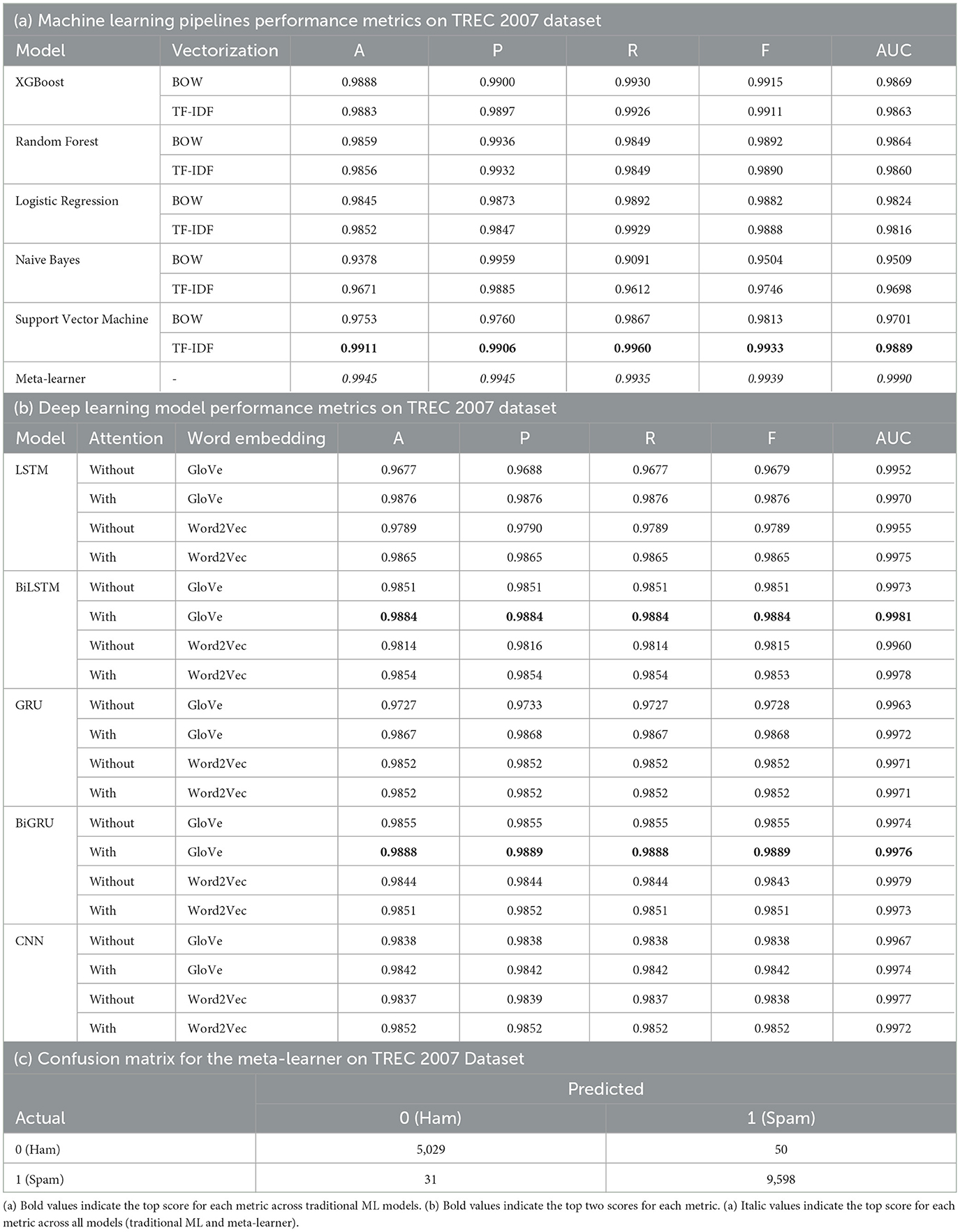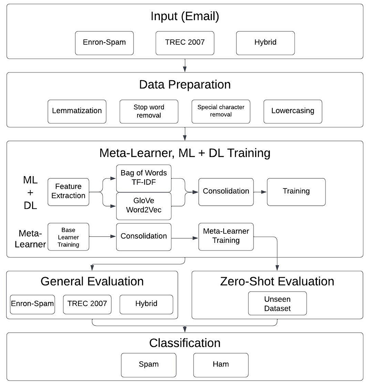 Methods: We compare five traditional machine-learning and five deep-learning spam classifiers against a novel meta-learner, evaluating how different word embeddings, vectorization schemes, and model architectures affect performance on the Enron-Spam and TREC 2007 datasets. The primary aim is to show how the meta-learner's combined predictions stack up against individual ML and DL approaches.
