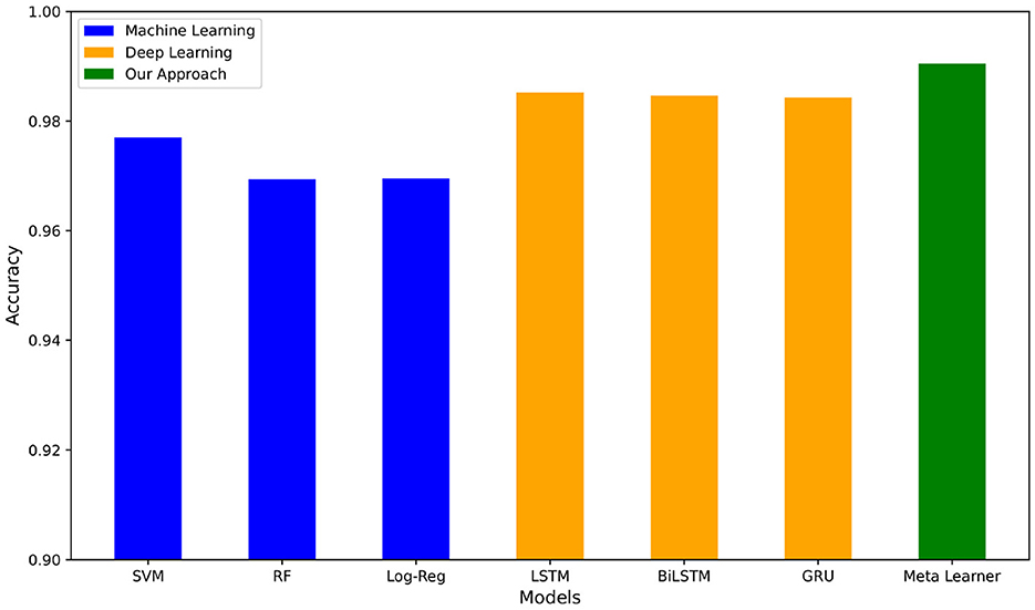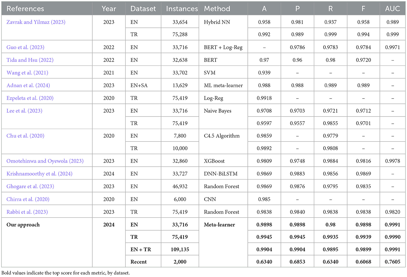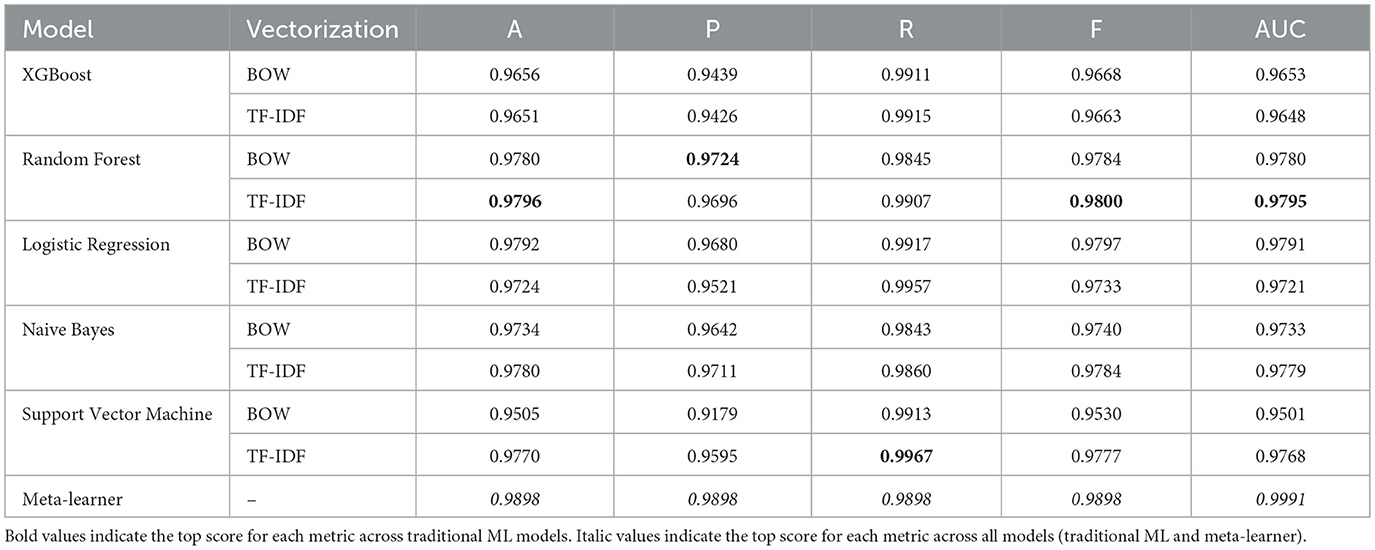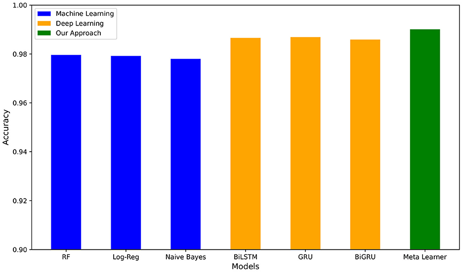 For machine learning models, we compare two vectorization approaches with five different models. The approaches are term frequency-inverse document frequency and bag of words, and the models are XGBoost, Random Forest, Logistic Regression, Naive Bayes, and Support Vector Machine. For deep learning models, we compare two types of word embeddings and two types of model architectures with five different models. The word embeddings used are GloVe and Word2Vec. The deep learning architectures we explore and models with attention layers and models without attention layers. The models compared are LSTM, BiLSTM, GRU, BiGRU, and CNN. Then, we propose a machine learning-based meta-learner model that outperforms all other models; it is tested in a zero-shot setting on an unseen real-world dataset.