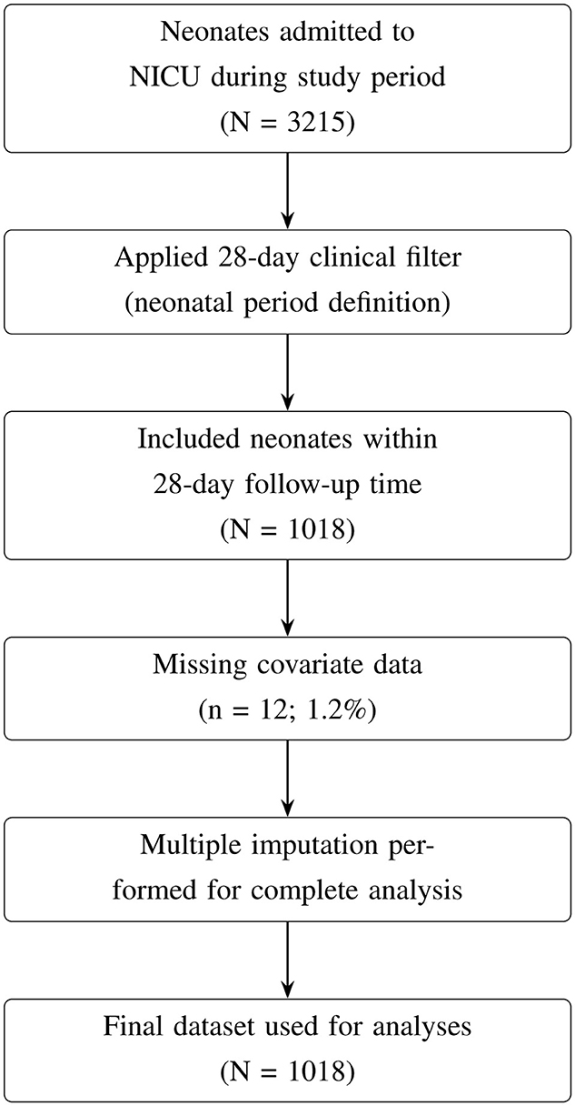Justification for population selection: the 68.3% reduction from the original dataset (3,215 → 1,018) is attributable to the 28-day clinical filter and reflects a deliberate focus on the neonatal period rather than data loss. This period captures the highest mortality risk and the most relevant clinical interventions for NICU patients.