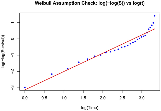 The CPH model was used as a baseline model in the study as a traditional survival analysis method. The Variance Inflation Factor (VIF) was used to assess multicollinearity. The VIF reflects how much the variance of the estimated coefficient for the variable is increased compared to what it would be if the predictor variables were uncorrelated. Values above 5 were noted as potential indicators of multicollinearity, suggesting the presence of redundant predictors. The proportional hazards assumption was formally tested using Schoenfeld residuals, examining both global and individual covariate tests. Variables violating the assumption were identified, and a stratified CPH model was fit by stratifying on the problematic covariates. However, the stratified model still violated the assumption, prompting the use of alternative parametric survival models. Two parametric models;Weibull and log-logistic accelerated failure time (AFT) models, were fit to account for the assumption violations. Model selection was guided by Akaike Information Criterion (AIC) and log-likelihood to assess model fit. Weibull model had a lower AIC value as well as higher log-likelihood values, and was therefore used as the final model. The Weibull model was assessed using a graphical check: Plot of log(–log(Survival)) vs. log(time); where a linear relationship indicates consistency with the Weibull assumption.