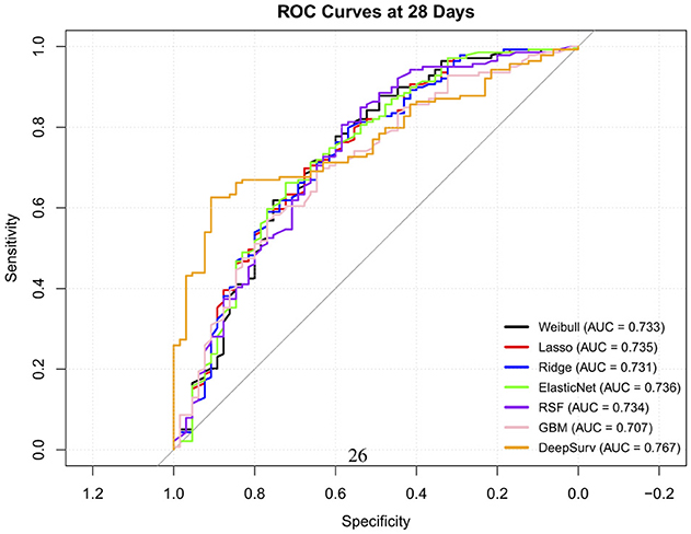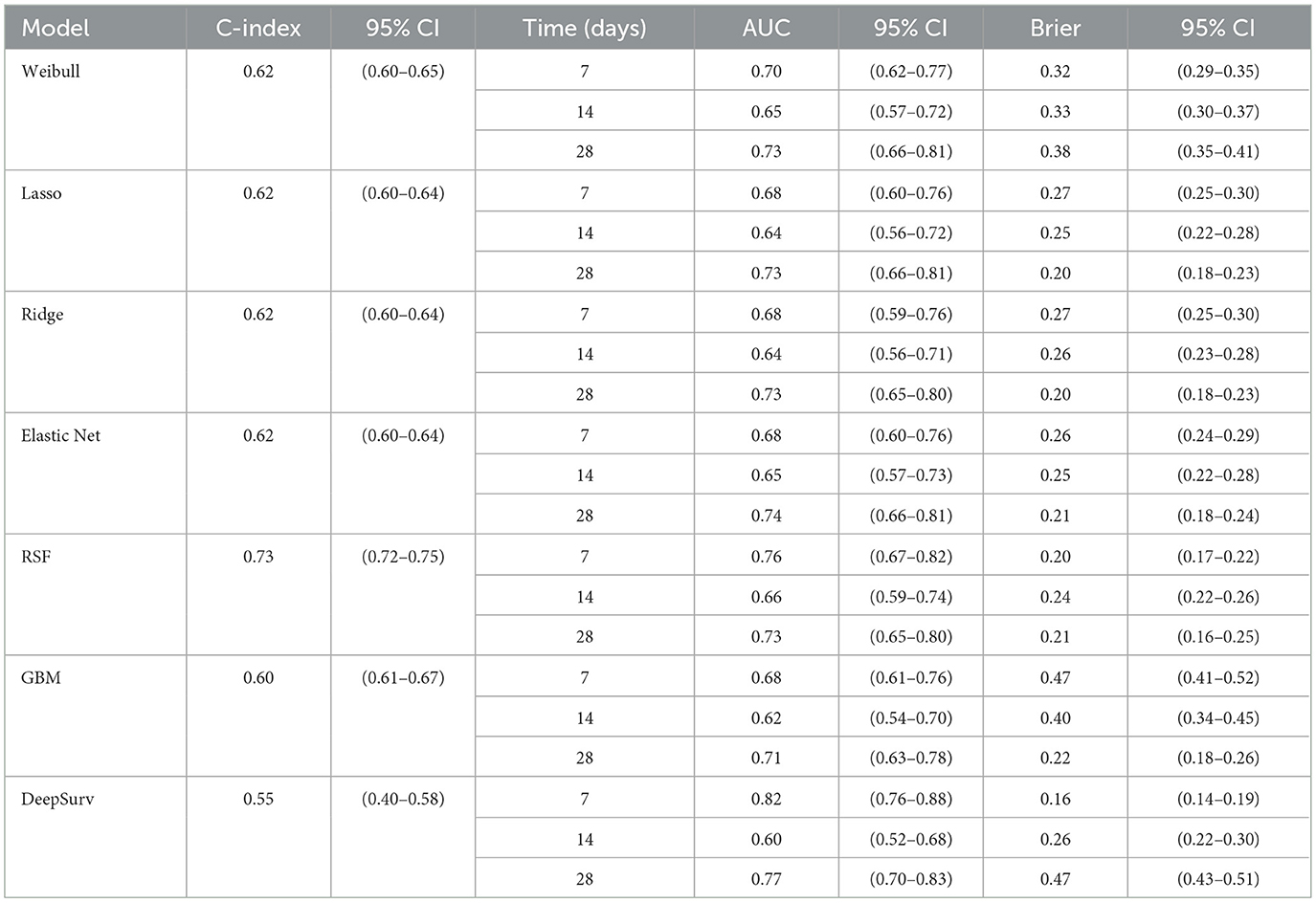 In contrast, DeepSurv yielded the lowest overall discrimination (C-index = 0.55; 95% CI: 0.40–0.58), with inconsistent time-dependent performance–excellent early discrimination (AUC = 0.82 at 7 days) but substantially reduced calibration at 28 days (Brier = 0.47). These fluctuations likely reflect model overfitting relative to the neural network's complexity.
