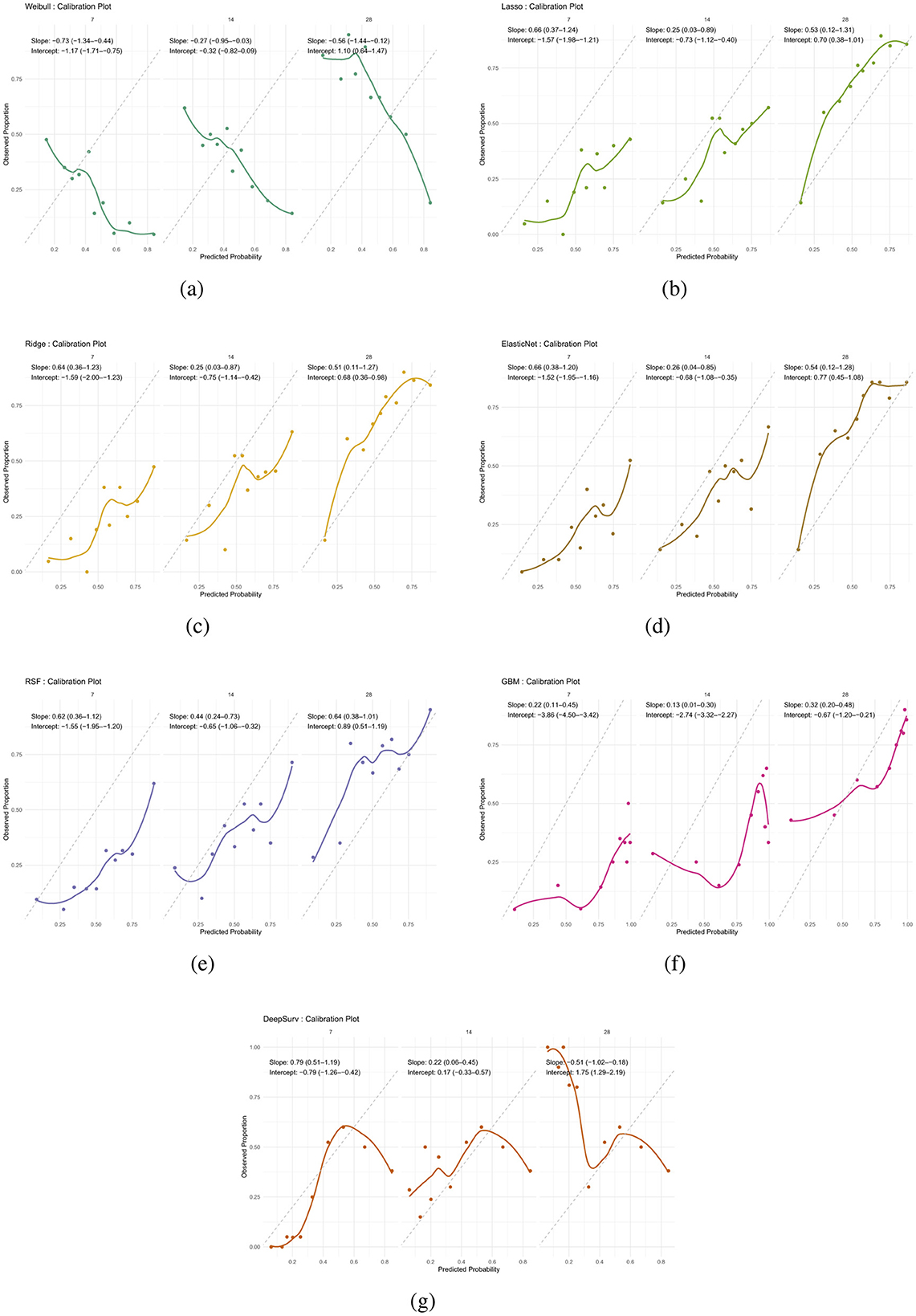 Figure 5. Calibration plots for all models at 28 days. Each plot compares predicted survival probabilities to observed outcomes. (a) Weibull. (b) Lasso. (c) Ridge. (d) Elastic Net. (e) RSF. (f) GBM. (g) DeepSurv.