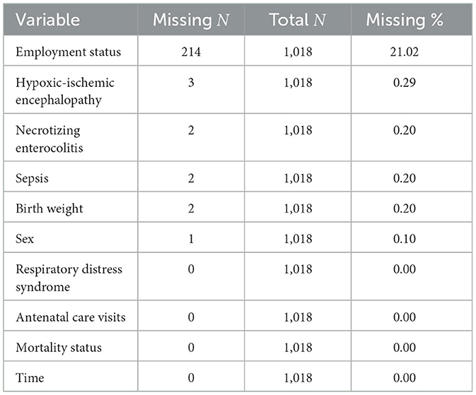 After applying the 28-day clinical filter, 1,018 neonates remained in the dataset. Of these, 12 neonates (1.2%) had missing covariate data, resulting in a final complete-case dataset of 1,006 neonates. Missing data were minimal across most variables (0.0%–0.3%), except for employment status (21.0%; Table 1).