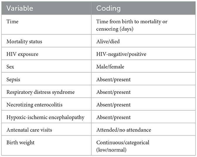 The outcome of this study was time to neonatal mortality, measured from birth to either mortality or censoring. Independent variables included human immunodeficiency virus (HIV) exposure, sex, sepsis, respiratory distress syndrome (RDS), necrotizing enterocolitis (NEC), hypoxic-ischemic encephalopathy (HIE), antenatal care (ANC) visits, and birth weight. These variables, along with their coding, are summarized in Table 2. Birth weight was categorized according to WHO standards of neonatal risk stratification as low (< 2.5 kg) or normal (≥2.5 kg) (WHO, 2022). For analysis, birth weight was included as a continuous variable in kilograms to retain full information and maximize statistical power. These variables were selected based on their clinical relevance and established associations with neonatal mortality, particularly in resource-limited neonatal settings.