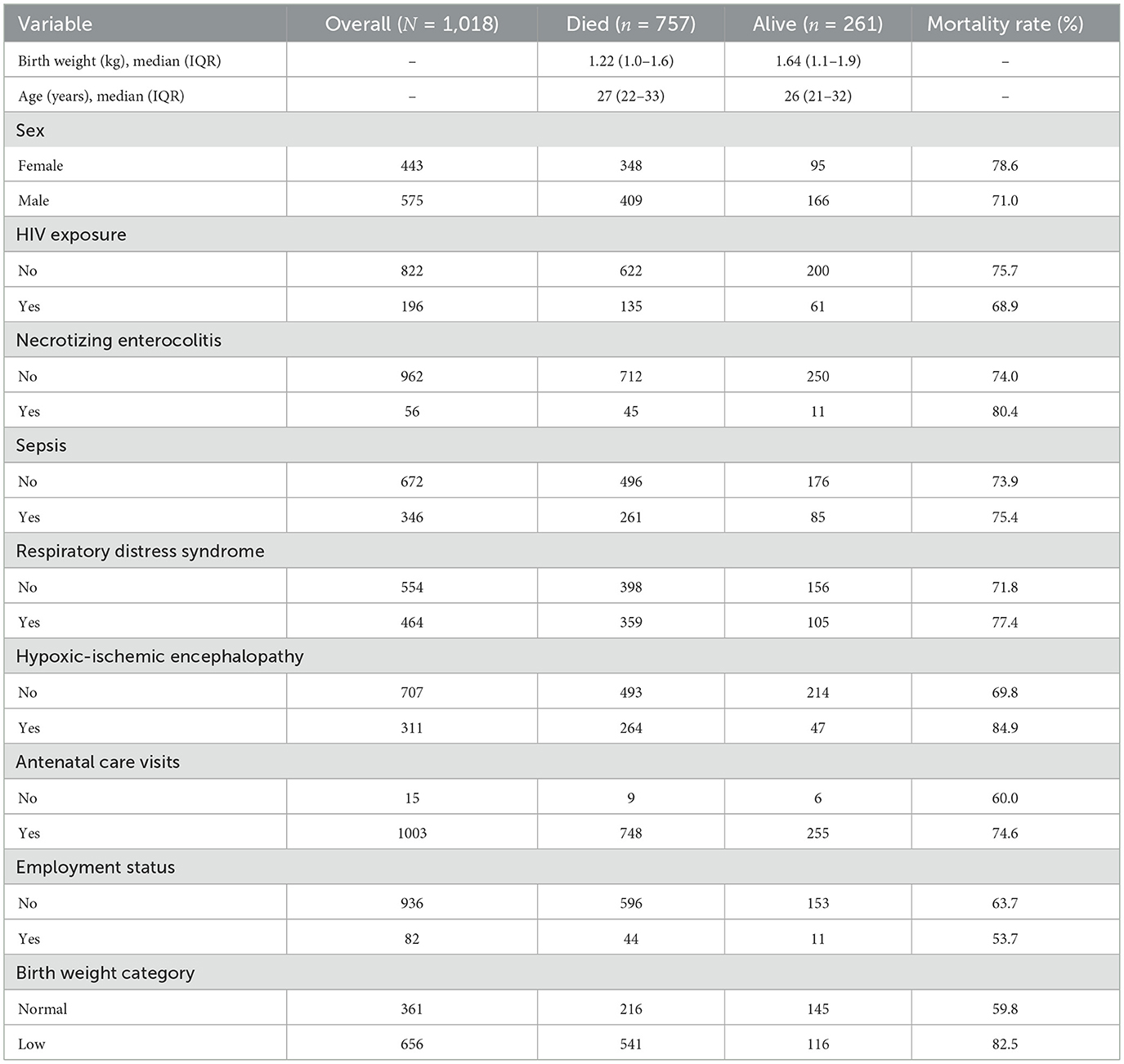 Among the 1,018 neonates included in the analysis, 261 survived and 757 died. Maternal characteristics showed the median age of mothers whose neonates survived was 27 years (IQR: 22–33), compared to 26 years (IQR: 21–32) among those whose neonates died (Table 3). The slight difference may indicate that neonates born to younger mothers may have experienced higher mortality. The median birth weight among the cohort was 1.22 kg (IQR: 1.0–1.6 kg) among neonates who died, compared with 1.64 kg (IQR: 1.1–1.9 kg) among survivors (Table 3).