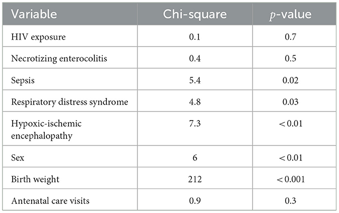 Mortality was higher among HIV-negative neonates (n = 622) compared to HIV-positive neonates (n = 135). The mortality rate was higher in the negative group (75.7%) compared to the positive group (68.9%). This may indicate better clinical management of HIV-positive neonates. Neonates without necrotizing enterocolitis accounted for most deaths (n = 712), while neonates with the condition had fewer deaths (n = 45). However, the mortality rate was higher among neonates with necrotizing enterocolitis (80.4%) compared to those without (74.0%), suggesting a possible trend toward worse outcomes. Sepsis showed an unusual pattern, with similar mortality rates between affected neonates and those without sepsis, despite its clinical relevance as a common cause of neonatal mortality. A higher number of deaths was observed in neonates with sepsis (n = 260) than those without (n = 496). Mortality rates were comparable between the two groups, with 75.4% of mortality in neonates with sepsis and 73.9% in those without sepsis.