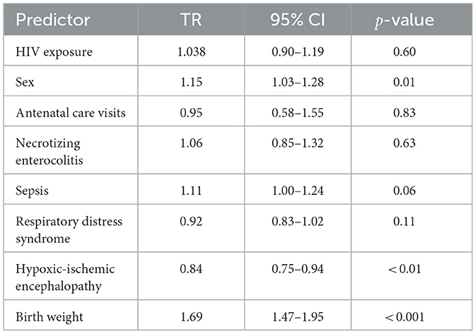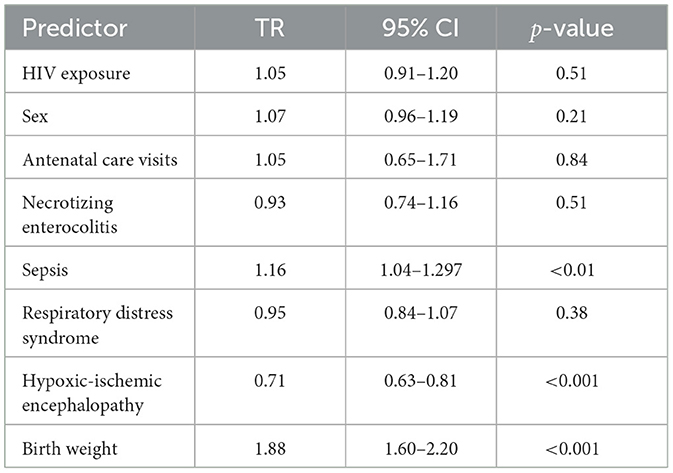 Birth weight consistently remained as a strong predictor and confirmed the well established association between low birth weight and neonatal mortality (Lee et al., 2013). Neonates who died had a median birth weight of 1.22 kg compared to 1.64 kg among survivors. Although more male neonates died in numbers, the mortality rate was higher among females (78.6% vs. 71.0%), supporting prior reports of sex specific vulnerability (Kent et al., 2012), though the literature remains mixed (Mondal et al., 2014). The consistency of birth weight as a significant factor highlights its effect as a more robust marker of neonatal vulnerability. Conversely, a study in Botswana by Kitt et al. (2022)), found low birth weight to be protective factor. HIE was associated with reduced survival (TR = 0.71, p < 0.001), consistent with its known role in neonatal morbidity and mortality (Shankaran et al., 2005). RDS and NEC were associated with high mortality rates, though their effects were reduced in adjusted models, likely reflecting overlapping clinical pathways and limited sample size for NEC cases.