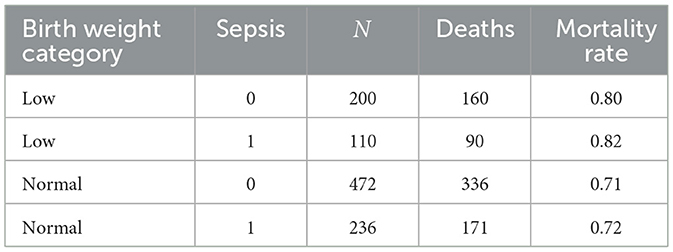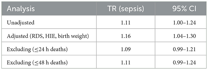 The unadjusted analysis suggested an association between sepsis and lower mortality (TR > 1), consistent with the observed sepsis paradox. Adjusting for birth weight and severity markers (RDS, HIE) revealed a more robust effect (TR = 1.16), indicating that the association in unadjusted models was partially due to confounding. Sensitivity analyses excluding early deaths (≤ 24 h and ≤ 48 h) produced similar TRs, suggesting that immortal time bias did not fully explain the paradox (Table 12).