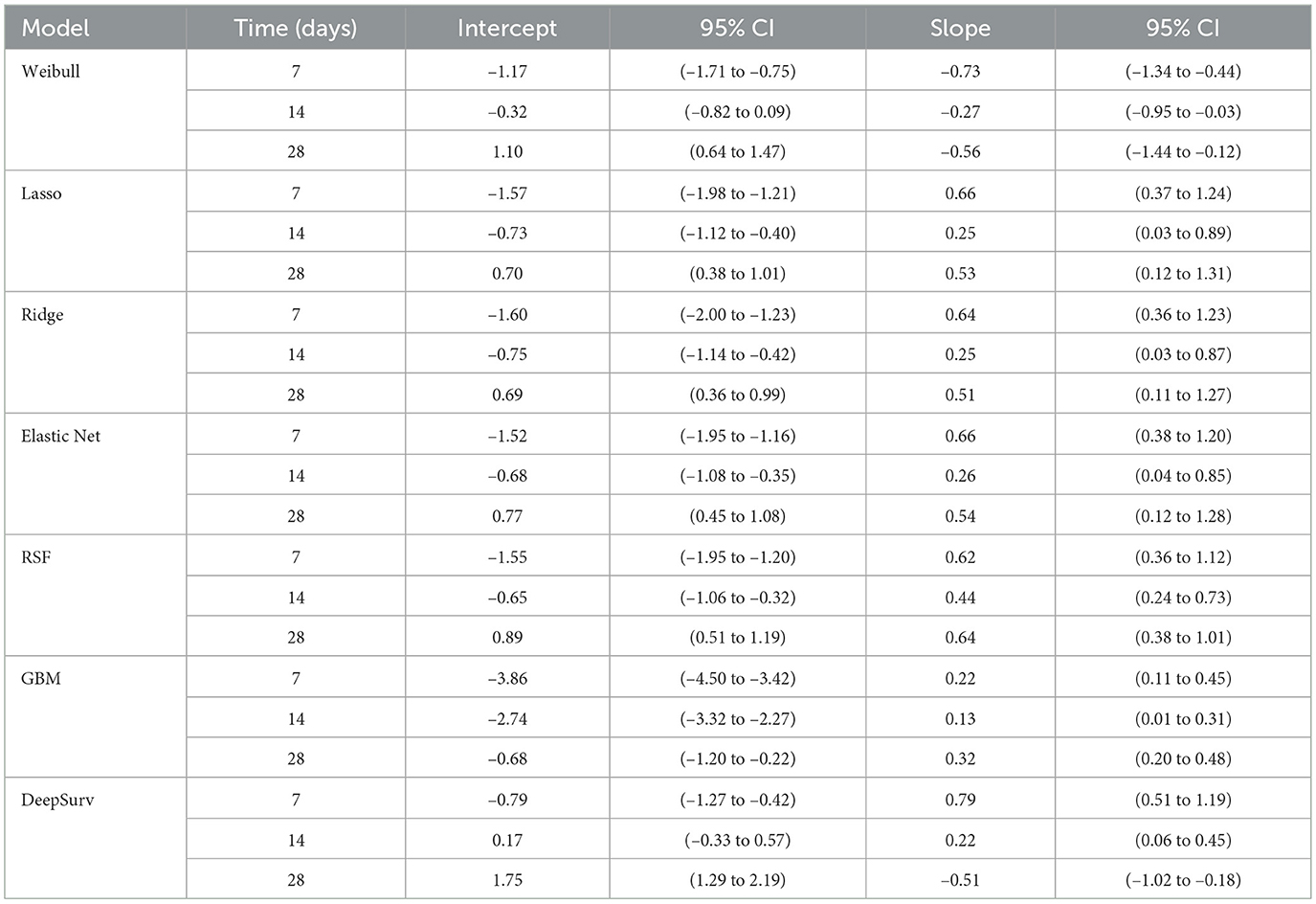 Calibration analysis revealed distinct patterns of prediction bias across models and time points (Table 14). The Weibull model consistently overpredicted risk at early time points, with negative intercepts and slopes well below 1 (day 7: intercept –1.17, slope –0.73), indicating both systematic bias and overestimation. Although its intercept improved by day 28 (1.10), the slope remained suboptimal (–0.56), suggesting persistent miscalibration (Figure 5a).