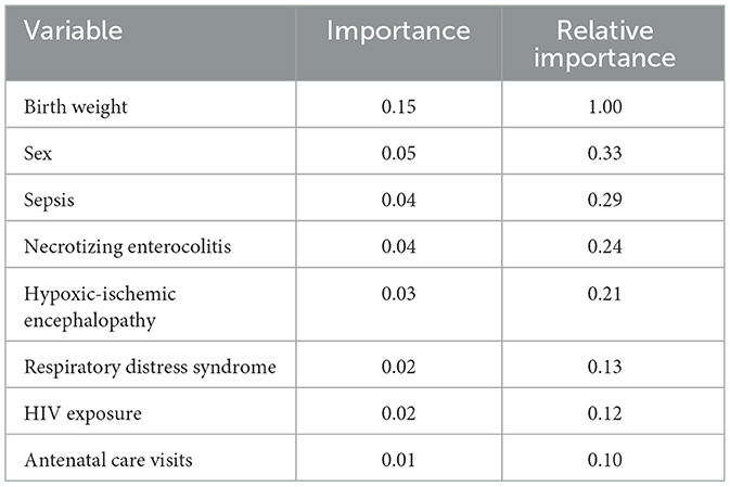 Neonatal sex, sepsis, and necrotizing enterocolitis emerged as the next most important predictors, each explaining roughly one-quarter to one-third of the predictive contribution of birth weight. Hypoxic-ischemic encephalopathy also demonstrated a meaningful effect, though of slightly lower magnitude. In contrast, respiratory distress, HIV exposure, and antenatal care visits were associated with lower importance values, indicating weaker contributions to overall model discrimination. These findings highlight the dominant role of birth weight in determining neonatal outcomes, while also highlighting the relevance of key clinical complications such as sepsis, necrotizing enterocolitis, and hypoxic-ischemic encephalopathy.