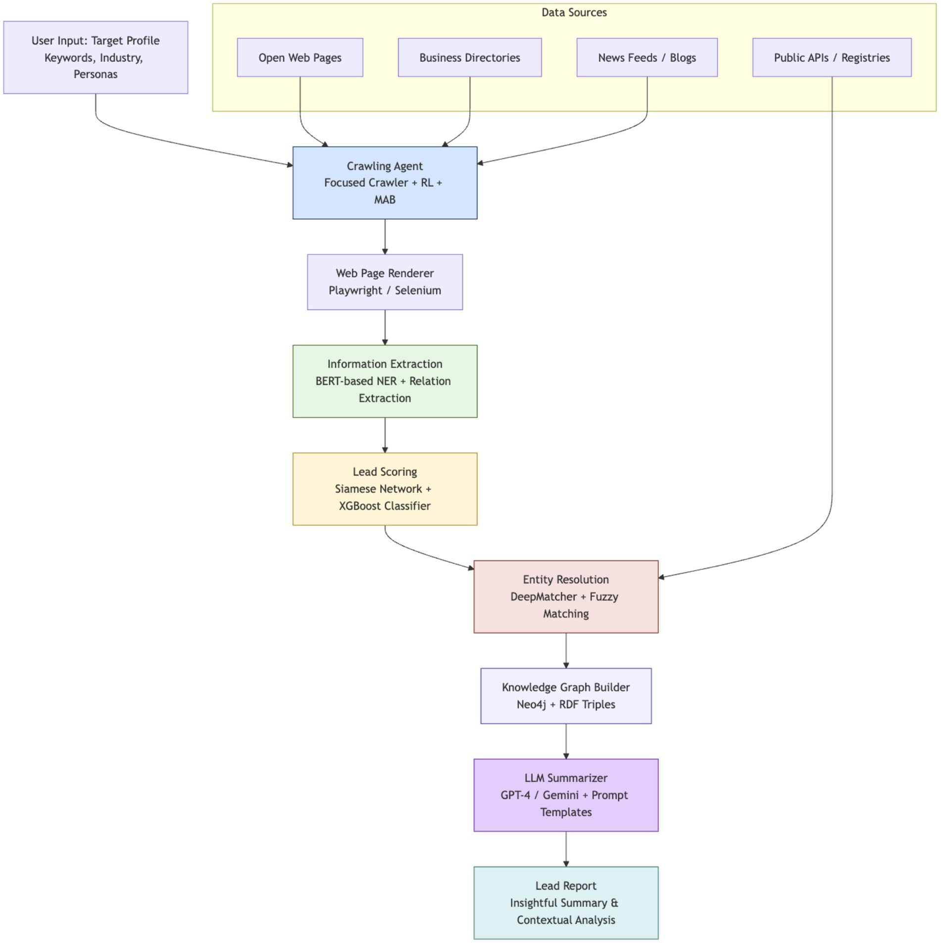 In conclusion, the related work spans multiple fields: web crawling, information extraction, entity resolution, machine learning for lead scoring, and text generation. Scrapus is an attempt to fuse these into one coherent system for AI-based lead generation. In doing so, it addresses gaps noted in earlier studies (no single work covered all steps) and takes advantage of state-of-the-art methods in each component. The next section (Methodology) delves deeper into how we realized this integration, detailing each component’s design and our implementation choices, many of which were informed by the literature discussed here.