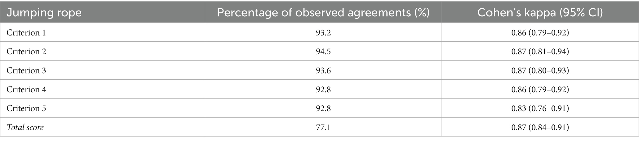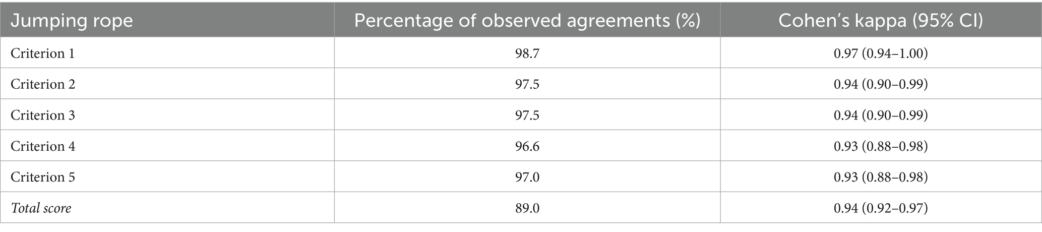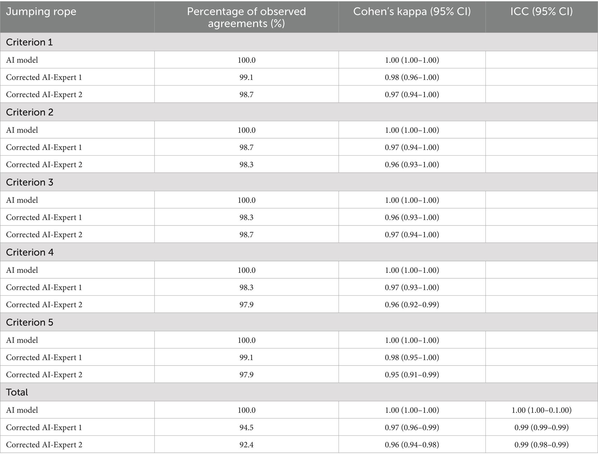 Table 2. Inter-rater reliability for jumping rope assessment between experts correcting AI-generated scores (n = 236).
