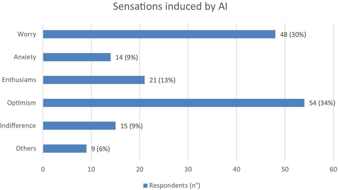 Figure 1. This graph reports the sensations of the responders (N = 161) induced by AI. Values shown next to each bar represent the number of respondents who selected that option, with the corresponding percentage in parentheses. The prevailing feelings are discordant: worry (N = 48) and optimism (N = 54).