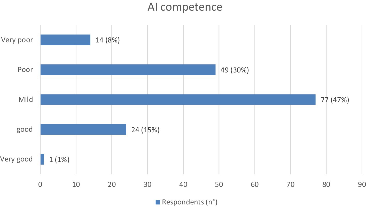 Competence and personal familiarity with the topic of AI were defined as mild by 77 (47%) of respondents, poor by 49 (30%), good by 24 (15%), very poor by 14 (8%), while only one (1%) respondent rated them as excellent (Figure 2).