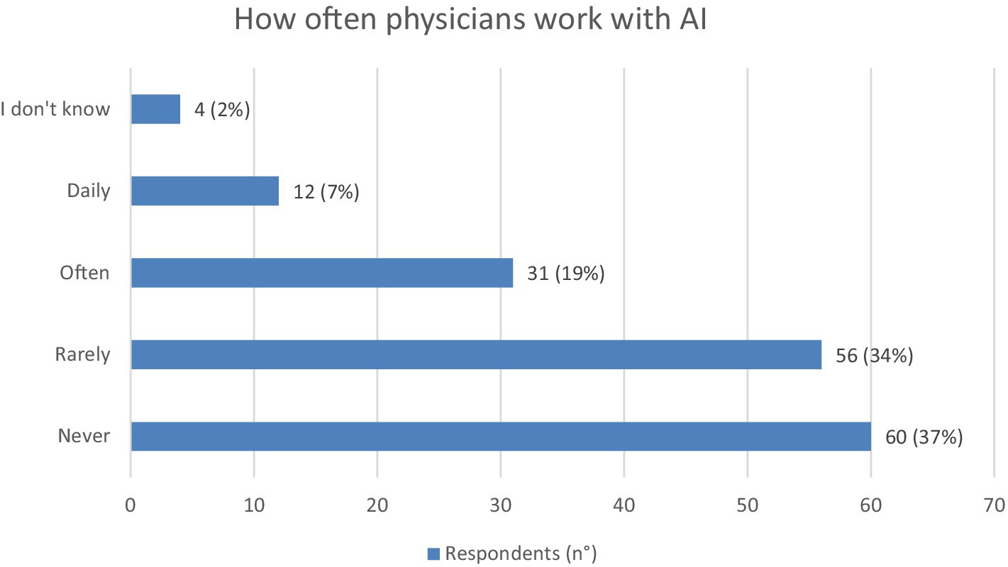 Figure 3. Graphic representation of how often the physician respondents (N = 163) work with AI. Values shown next to each bar represent the number of respondents who selected that option, with the corresponding percentage in parentheses. The most frequent responses was “never” or “rarely.” Only 4/163 respond “I do not know.”