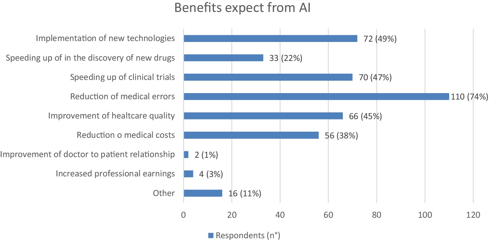 The 98% of the sample believes that the use of AI will bring benefits in the healthcare sector and the three main expected benefits were, in order, the reduction of medical errors: 110 (74%), the implementation of new biomedical technologies: 72 (49%) and the speeding up of medical trials: 70 (47%) (Figure 4).