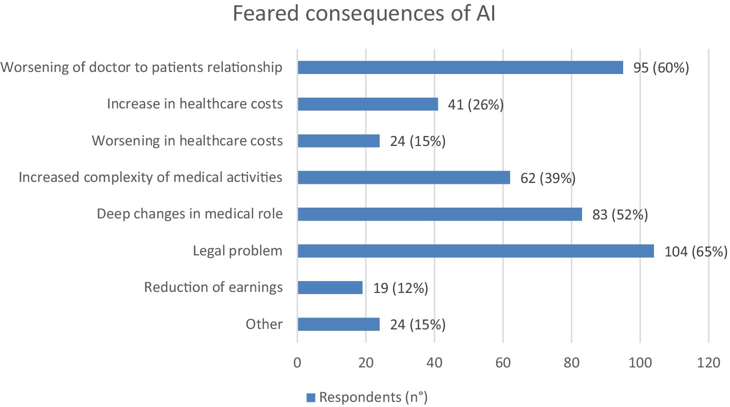 Figure 5. Graphic representation of the most feared consequences of AI according to respondents (N = 159), each of whom was asked to indicate their three main perceived negative consequences. Values shown next to each bar represent the number of respondents who selected that option, with the corresponding percentage in parentheses. Legal problems and worsening of doctor to patients relationship were the most feared consequences expected from physicians. Not all respondents indicate three preferences.